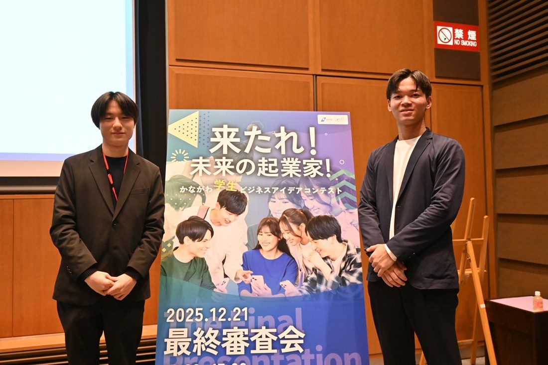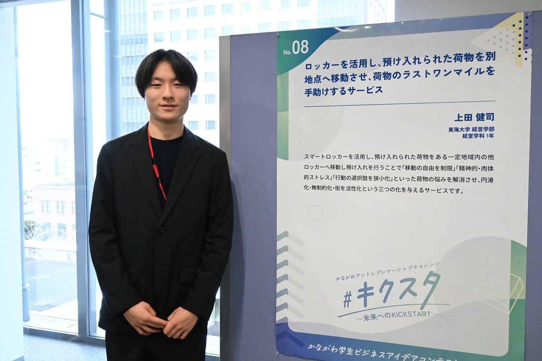 経営学部経営学科1年次生の上田健司さんが、昨年12月21日に神奈川県・横浜情報文化センターで開かれた「かながわ学生ビジネスアイデアコンテスト最終審査会」(主催=神奈川県)で、同コンテストの最高賞にあたる神奈川県知事賞を受賞しました。同コンテストは、県が多くのベンチャー企業創出に向けて起業の魅力を伝え、将来の選択肢の一つとして起業を捉えてもらおうと、県内在住または在学の30歳未満の学生を対象に開催しています。当日は、89チームの応募の中から書類選考を通過した9チームがファイナリストプレゼンテーションに臨み、県内に活動拠点を置くさまざまな企業の代表者らが審査員を務めました。