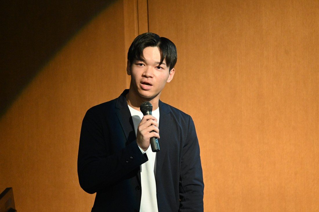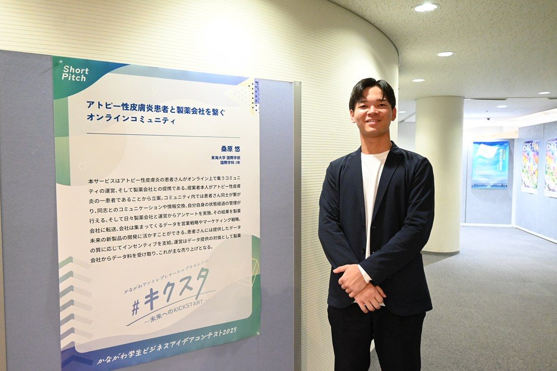 また、ファイナリストプレゼンテーションの次点にあたるアイデアを紹介するショートピッチでは国際学部3年次生の桑原悠さんも参加。自身の経験に基づいて、「アトピー性皮膚炎患者と製薬会社を繋ぐオンラインコミュニティ」をテーマにアイデアを発表しました。桑原さんは「発表の準備はそのまま就職活動に役立ちました。今日も他の人の発表を見て刺激を受けました。社会で経験を積んで将来は起業したい」と話しました。