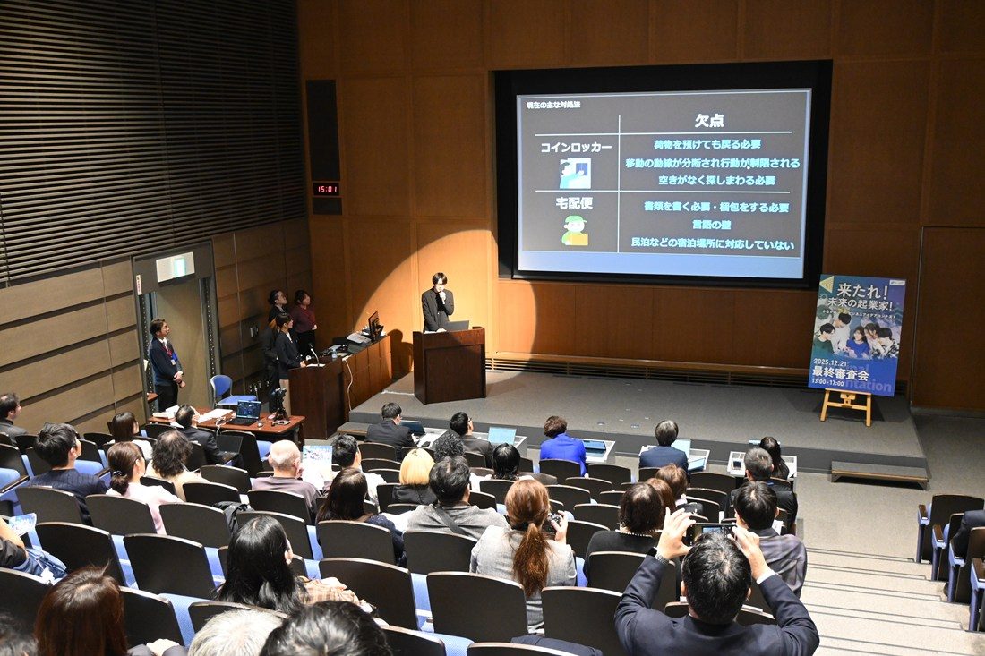 アイデアをまとめるにあたり、昨年11月に東京都の押上、浅草、上野、浅草、秋葉原の4エリアで訪日観光客ファミリー層23組にアンケートを取り、「83%の方が荷物の管理が面倒だと回答しました」と結果を紹介。「このサービスを活用することで観光客の行動が自由になり、旅の選択肢や柔軟性が広がります。結果的に訪問地が分散することでオーバーツーリズムも解消されるほか、多くの地域で雇用や投資が増え、移住者の増加など街の活性化にもつながると考えます」と力説しました。上田さんは神奈川県の黒岩祐治知事に対面でプレゼンテーションする機会が授与されます。「思いがけない受賞で、アイデア実用化への期待と同時に大きな責任も感じます。将来は社会貢献に関わりたいと考えており、このアイデアが社会に役立つよう、多くの人の力を借りて磨き上げていきたい」と抱負を話しました。