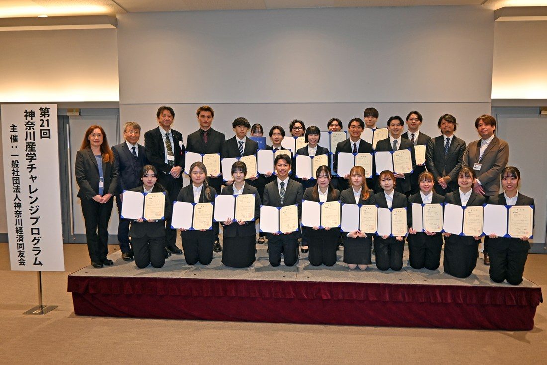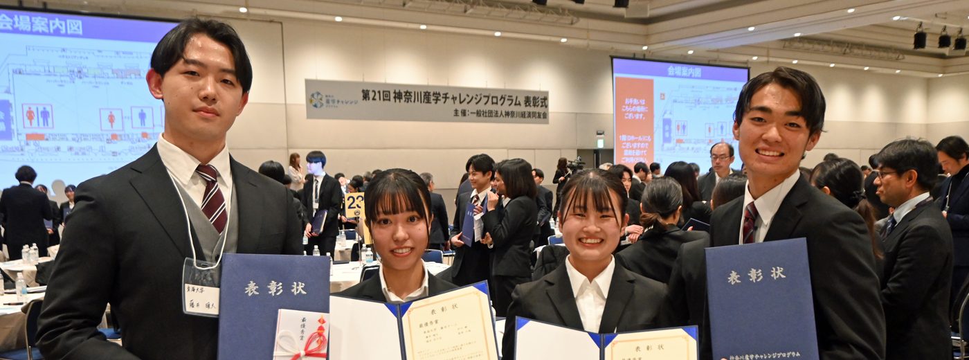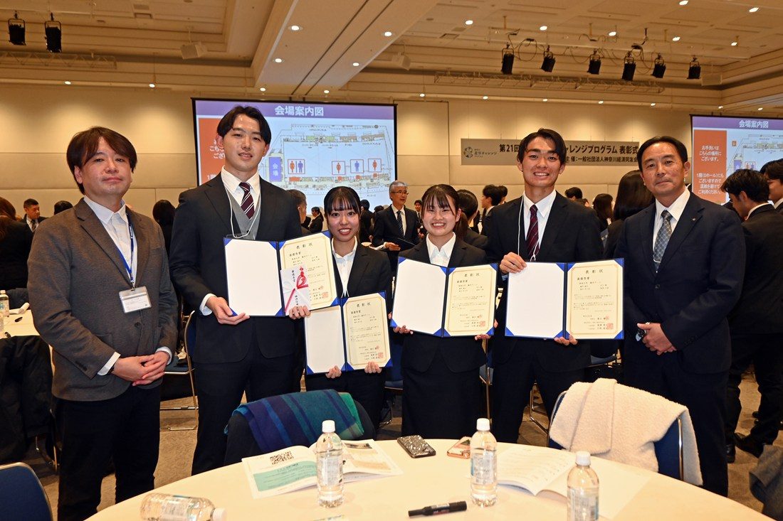 文化社会学部広報メディア学科の野口将輝准教授の研究室に所属する「藤井チーム」が12月16日に、神奈川県・パシフィコ横浜アネックスホールで表彰式が行われた課題解決型研究プログラム「神奈川産学チャレンジプログラム」(主催:一般社団法人神奈川経済同友会)で最優秀賞を受賞しました。