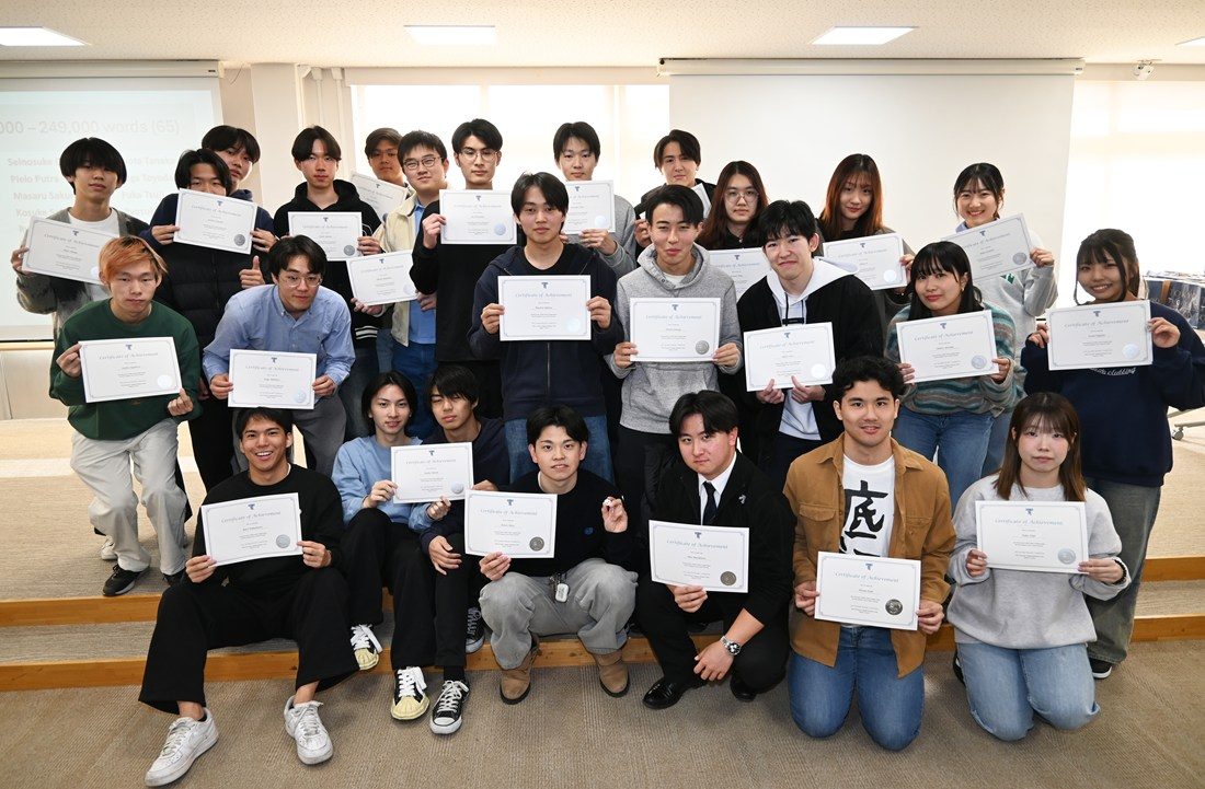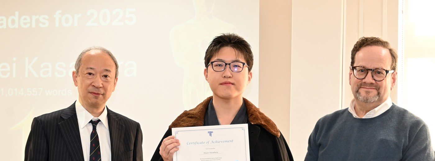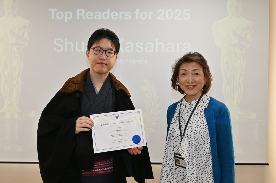 語学教育センターでは1月19日に湘南キャンパスで、「2025年度Mリーダー・チャレンジ(MReader Challenge)」の表彰式を実施しました。本センターでは、英語の副読本「グレーデッド・リーダー(Graded Readers=GR)」を多読することで語彙力、読解力を高めてもらおうと、03年度から「グレーデッド・リーダー・プロジェクト」を展開しています。GRは英語を母語としない学習者用のリーディング教材で、本センターの教員が授業の際に貸し出すほか、1号館1階にある「Global AGORA」の「言語学習支援室(L-Navi)」でも利用可能です。14年度にはGR利用者の学習進捗状況を管理する学習支援ウェブサイト「MReader」を導入。各年度に一定量以上のGRを読了した学生を表彰するリーディング・コンテスト「Mリーダー・チャレンジ」を実施して、学生の積極的な英語学習を促しています。
