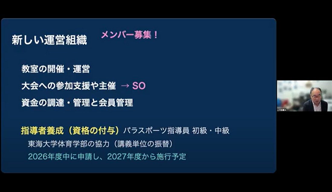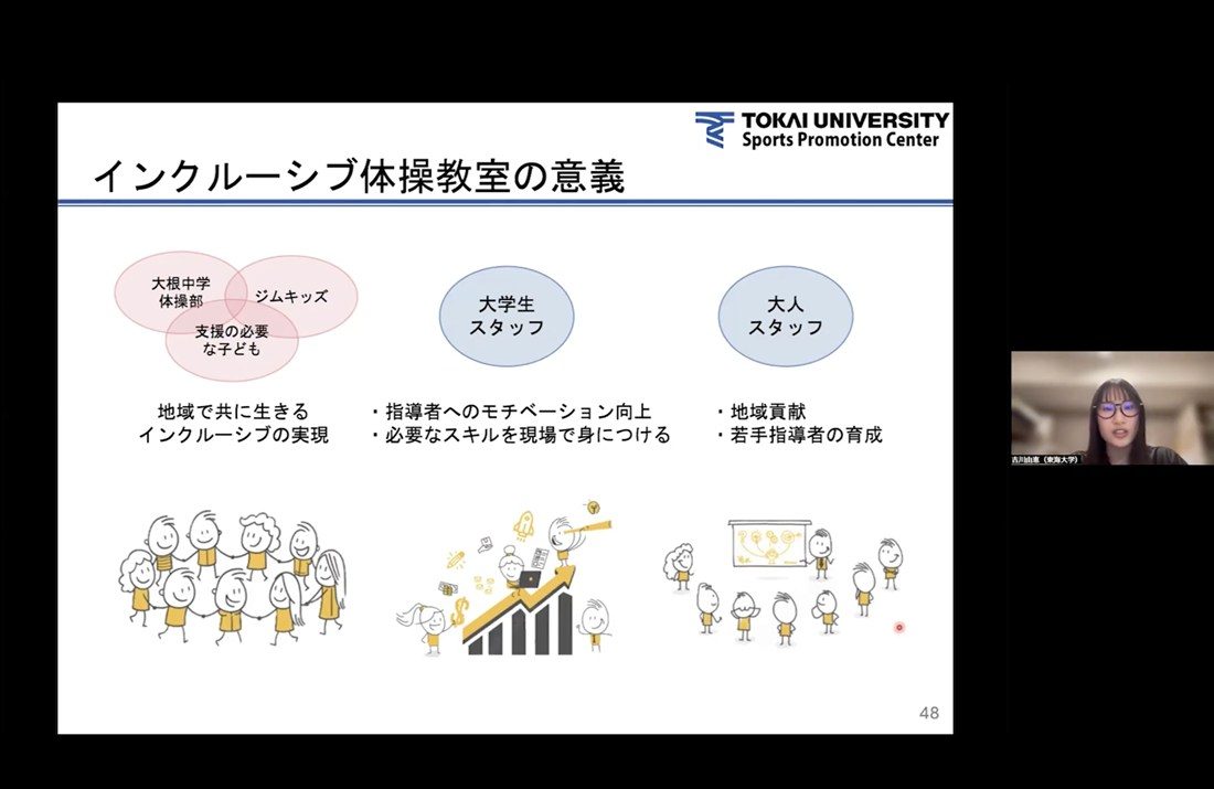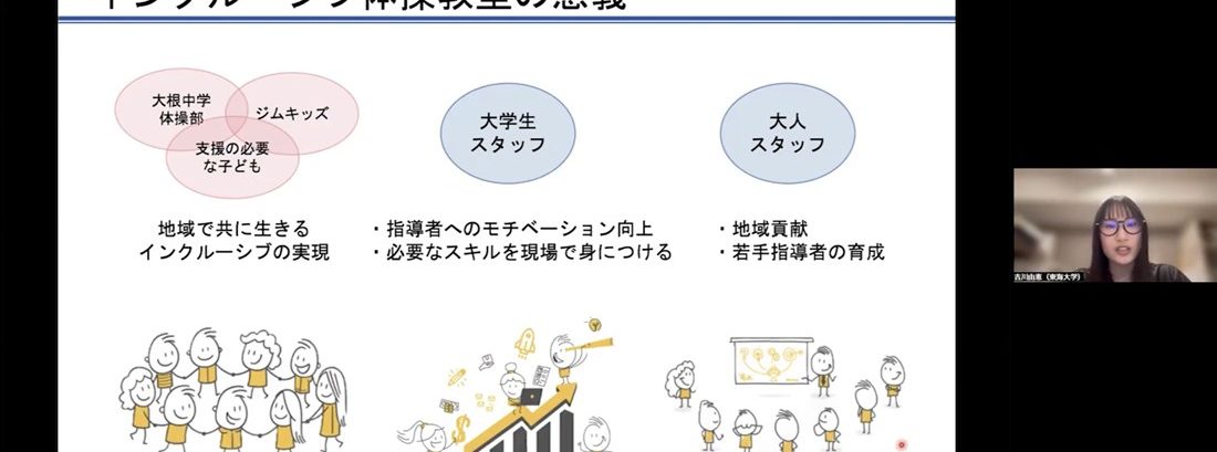 また、体操競技部の吉川由恵コーチ(スポーツプロモーションセンター非常勤講師)が、スポーツ庁の「感動する大学スポーツ総合支援事業」の委託を受けて実施している「インクルーシブな体操教室」について報告しました。特別支援の必要な子どもを含めた体操教室として定期的に開催しているもので、過去の事例や概要を写真と共に紹介。学生指導者の育成や共生社会の実現といった意義や、今後の改善点などを語りました。最後に小河原部長が、体操競技のパラリンピック競技化を希望する声が多い実情を紹介し、指導者養成や教室、大会の開催といった今後の展望を報告しました。