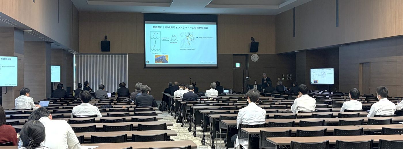 前半は、熊本大の澤智裕教授が「超硫黄による食細胞機能の制御」をテーマに講演。複数の硫黄原子が連結し、代謝や免疫といった多様な機能を持つ「超硫黄」が、炎症応答を抑制するメカニズムについて解説しました。東海大の渡辺恒二教授は、「腸管原虫赤痢アメーバ:体内における病原制御機構について」と題して、腸管原虫赤痢アメーバにより引き起こされる疾患の国内診療体制構築に関する話題に加え、熊本大学との共同で実施している病原制御機構に関する解析の進捗状況や新たな研究提案を紹介しました。