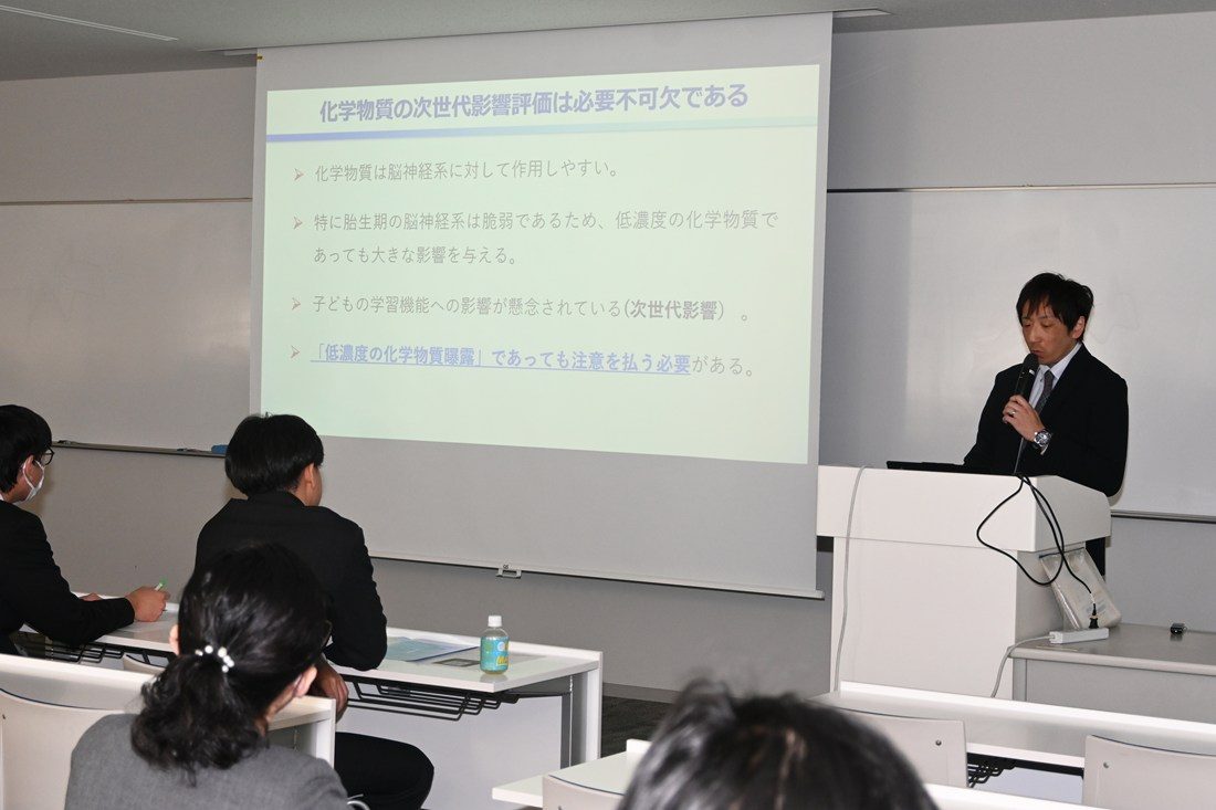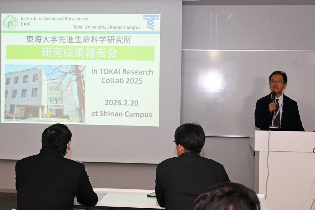 また、先進生命科学研究所による「研究プロジェクト成果報告会」では、岩岡道夫所長(理学部教授)が学部学科横断型の研究活動を紹介。所属する理学部化学科の小口真一教授と関根嘉香教授、農学部の米田一成教授が登壇し、自身が取り組む研究の概要や学外機関との連携事例について解説しました。学園の教員を対象に競争的研究資金の獲得を目指す研究を公募して育成・複数年の研究費支援を行う「総合研究機構プロジェクト研究」の成果発表会では、3年間の採択期間を終える2課題について発表。医学部の遠藤整准教授と森屋宏美准教授が登壇。プロジェクト研究の支援を受けて取り組んだ研究を振り返り、成果や課題、今後の展望などを語りました。