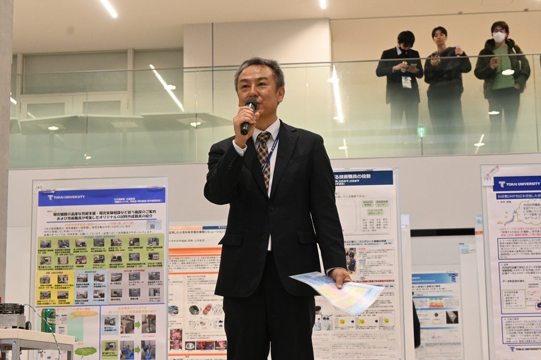 初めに学長室(研究推進・産学連携担当)の中島孝部長(情報理工学部教授)があいさつに立ち、「教員や学生、企業関係者らがこれだけ大きな規模で研究成果を披露するイベントは全国の大学の中でも大変珍しいと思います。参加者の皆さまには多くの講演や発表、ポスター発表などに耳を傾けていただき、東海大でどのような研究が行われているのか、どのようなコラボレーションが可能であるかを考え議論していただきたい」と語りました。続いて、高木啓介特任講師(総合科学技術研究所・URA/GTIE担当)が登壇し、「研究×社会実装×スタートアップ:JST GTIEと創る東海大学スタートアップエコシステム」と題して講演。本学が2024年度から参画するGTIE(大学発スタートアップ創出を目指すプラットフォーム)の概要やGTIEに採択された学内の研究事例を紹介。「エントリーコ―ス」に採択された総合科学技術研究所の野原徹雄研究員と農学部の永井竜児教授がビデオメッセージで自身の研究概要を説明し、「エクスプロールコース」に採択された医学部の林丈晴教授は会場で、心筋症の新規治療薬の実用化に向けたプロジェクトについて解説し、「世界中の患者さんと医師に新薬を届けたい」と目標を語りました。