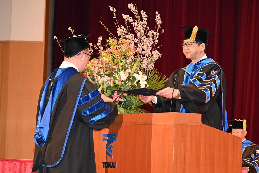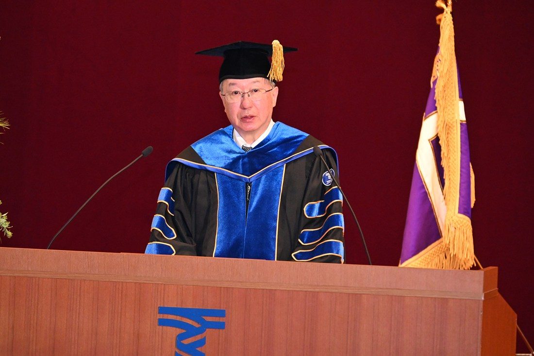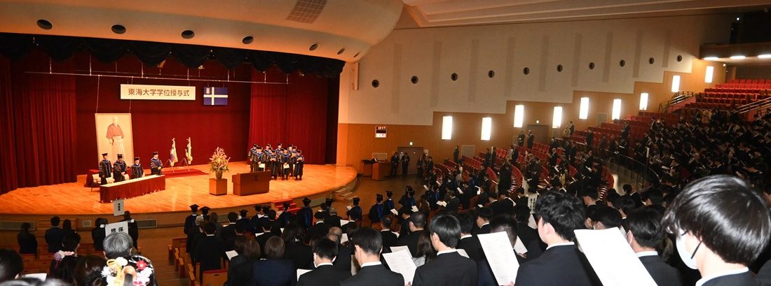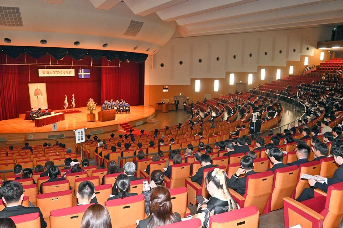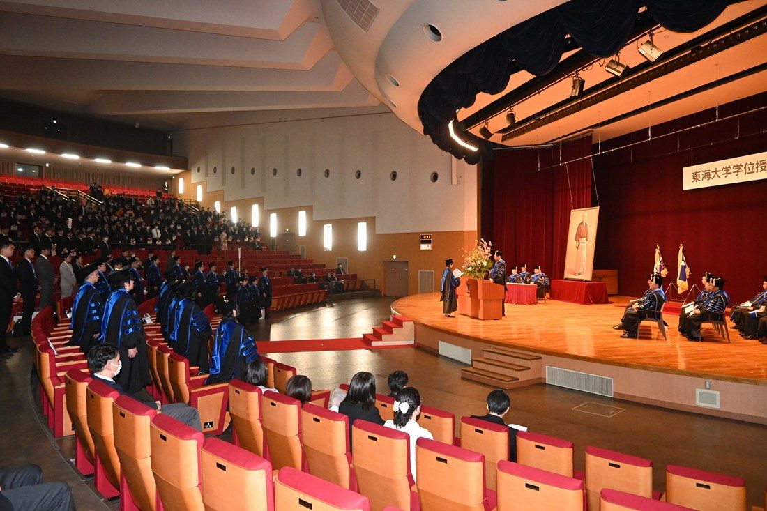 祝辞では学校法人東海大学の松前義昭総長・理事長が登壇。創立者・松前重義による文理融合の理念を解説し、「創立者は、文系の学生には自然科学との関連において人文科学の真髄を把握させる、理系の学生には確固たる人間観世界観を把握し、科学使命を自覚させると掲げていました。21世紀は科学と倫理の葛藤の時代となると言われています。皆さんが新しい文明を切り拓き、社会の活力を生み出す指導者、研究者、知識人として活躍されることを期待しています」と激励しました。