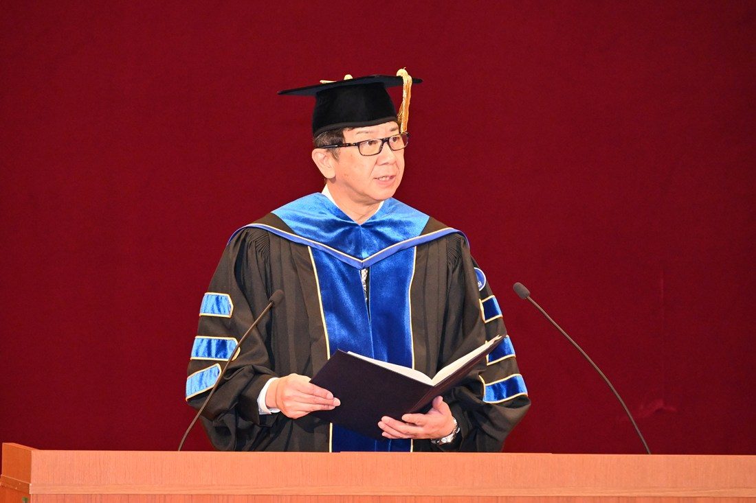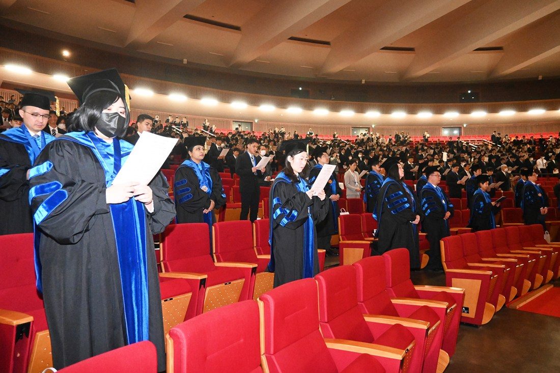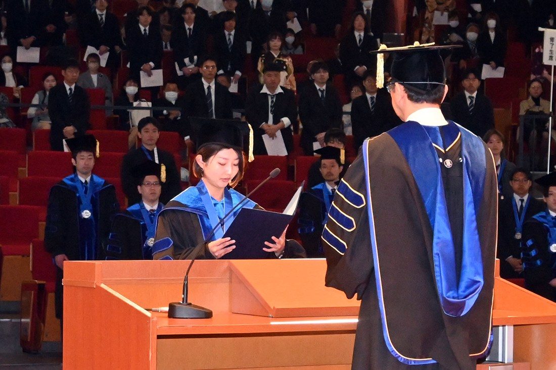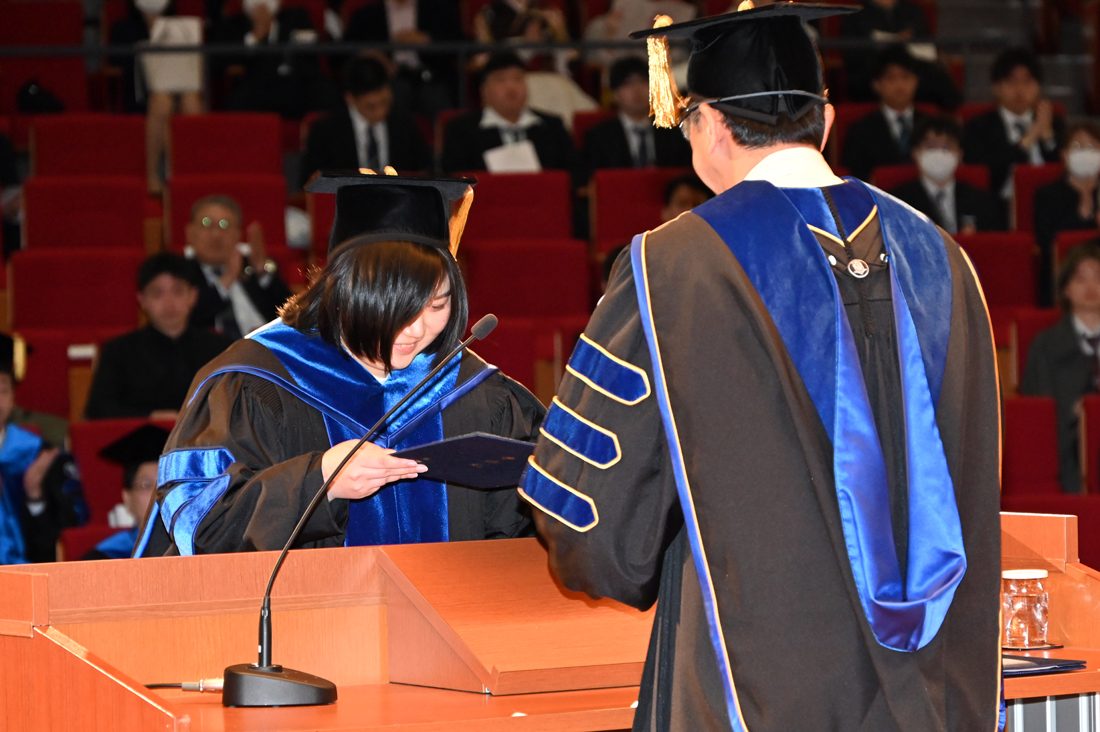 木村学長は式辞で、大学院生らの指導にあたった教員や保護者の皆さんへの祝辞を述べるとともに、自らが本学大学院で博士の学位を取得した際の学位授与式で当時の松前紀男学長が寄せた祝辞を引用し、「松前学長は、”学位取得は一つの通過点に過ぎず、周囲から期待される高度な人材としてスタートラインに立ったところである。これからもいっそう研鑽を重ね、人類が幸福な生活を送ることができる社会の実現に寄与してほしい“とおっしゃられていました。私自身も学位取得こそが新たな出発点であり、多くの役割と課題に向き合う日々でした。一方で、その分やりがいのある仕事に携わることができたとも感じております。皆さんも大学院で培った知見や能力を社会のために存分に発揮し、自身の人生をより豊かなものにしてください」と呼びかけました。