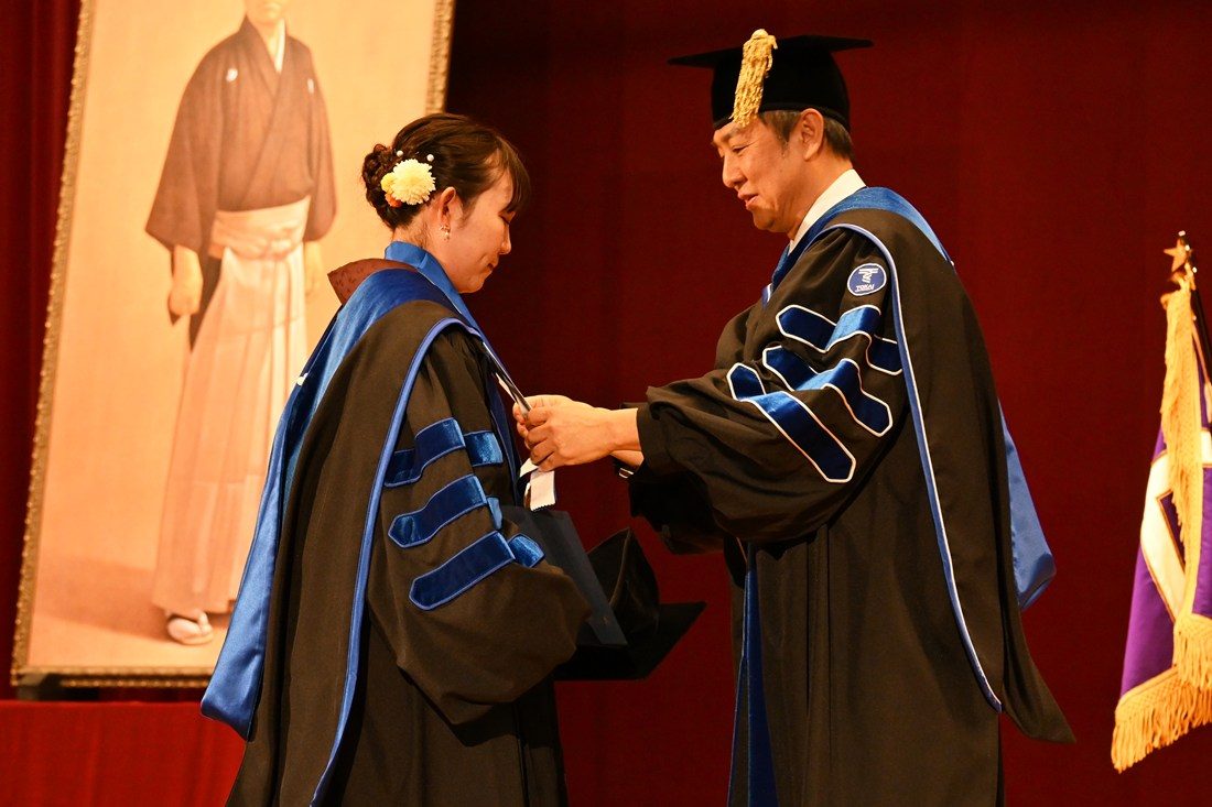 湘南キャンパスで3月24日に、大学院を対象とした2025年度秋学期学位授与式を挙行しました。各キャンパスにある大学院各研究科から博士学位取得者28名(課程博士18名、論文博士10名)、湘南、品川、伊勢原の大学院修士課程から修士学位取得者427名が卒業を迎えました。2号館大ホールで実施した式典では、木村英樹学長から学位記を、各研究科長からメダルを授与しました。なお、25日には湘南で学部を対象とした学位授与式を行います。また、本学では19日に熊本、21日に札幌、23日に静岡の各キャンパスでも学位授与式を挙行し、大学院生も多数が卒業しました。
