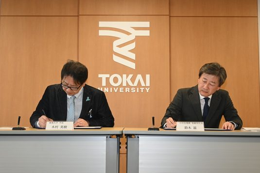 東海大学ではこのほど、小田急電鉄株式会社と教育・研究活動および地域価値創造に関する包括連携協定を締結しました。3月30日には湘南キャンパスで締結式を開き、本学の木村英樹学長と小田急電鉄の鈴木滋社長が協定書に調印しました。