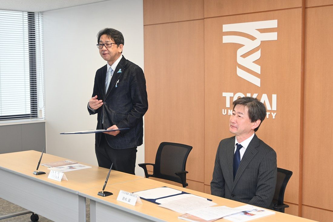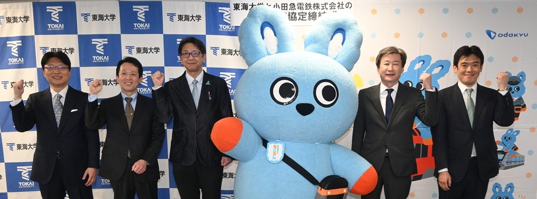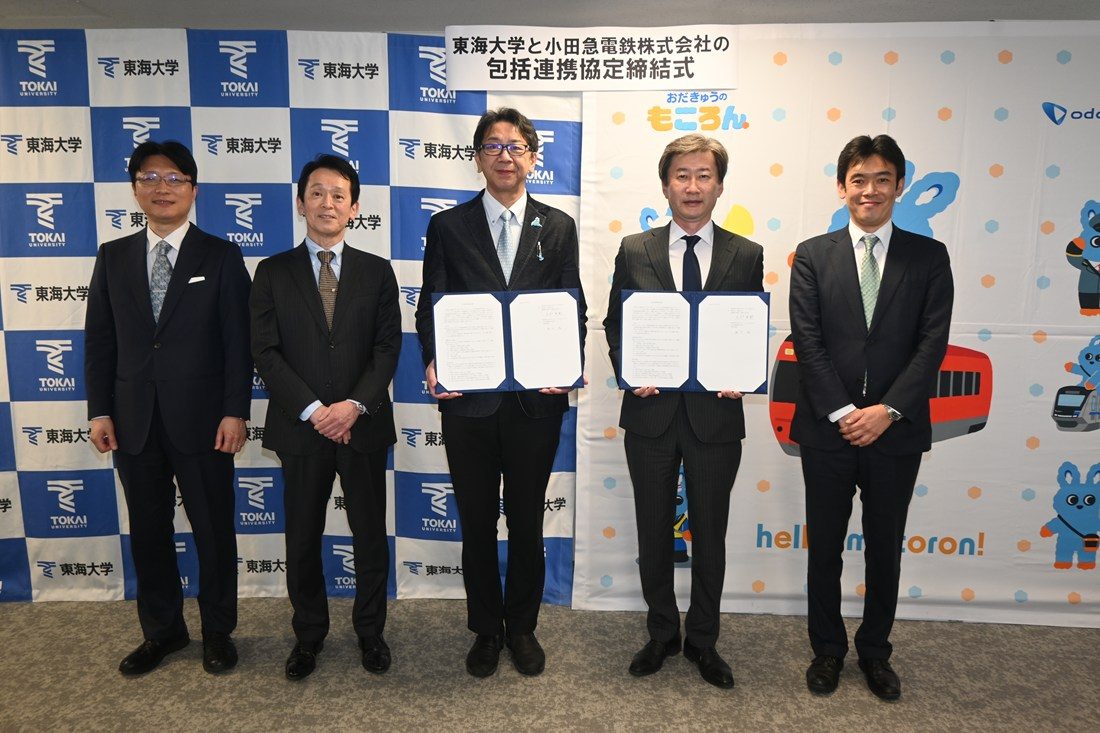 東海大学ではこのほど、小田急電鉄株式会社と教育・研究活動および地域価値創造に関する包括連携協定を締結しました。3月30日には湘南キャンパスで締結式を開き、本学の木村英樹学長と小田急電鉄の鈴木滋社長が協定書に調印しました。