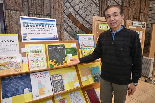 2月は、司書課程の授業「図書サービス特論」と「児童サービス論」を履修する学生たちが「東海大学生のおすすめ本」と題して、同館所蔵の本を紹介するPOPと共に展示しました。POPは、絵本や小説、実用書など、多岐にわたるジャンルの書籍の魅力が、短いコメントとともに写真やイラストなどで彩られています。同授業を担当した丸島隆雄非常勤講師は、「コンテンツのデジタル化が進み娯楽が多様化する昨今、図書館は従来の貸し出しと蔵書管理だけでは生き残れないという課題があり、積極的に人を呼び込むアクションが必要です。こうした展示企画もその一つ。この取り組みがモデルケースとなって、今後も市と大学の連携事業が広がっていくとうれしい」と話します。中央図書館館長代理の仁和佳世子氏は、「入口を入ってすぐのスペースに展示することで、子どもからお年寄りまで幅広い世代の方が興味を示し立ち寄ってくれています。POPの横には書籍貸し出し中に使う予約シートを設置しているのですが、これが毎日減っているため、POPが書籍を読むきっかけになっていることを実感しています」と語っています。