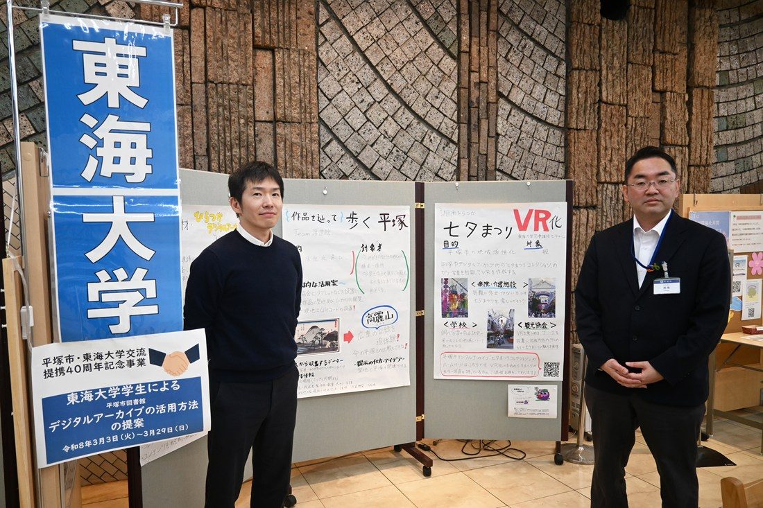 3月には、西田洋平准教授が担当する授業「図書館情報学総合演習A」の履修学生たちによる「平塚市図書館デジタルアーカイブの活用方法」をテーマにした企画展示を実施しました。2024年度に市所蔵資料のデジタルアーカイブをリニューアルしていることから、一般への周知を広げることを目的とした活用方法を検討。学生たちは、市担当者による特別講義やアーカイブ化の実践演習や展示物の制作などに取り組み、「湘南ひらつか七夕まつり」の過去写真を集めてVR化する企画をはじめ、防災や観光に役立てようと4企画のポスターを展示しました。学生からは、「デジタルアーカイブでどのような資料を見ることができるのか、どういった目的のために作られているのかがよく分かり、事業を通じて平塚市のよさを伝えファンを増やしたいという思いが伝わりました」「地域特有のお祭りや歴史的な出来事を記録し、だれもがアクセスできる形で残しておくことで、過去・現在の事象を未来へつなぐ、また、ほかの地域の方に知ってもらう重要な手段になるとあらためて実感しました」といった声が聞かれました。西田准教授は、「図書館の仕事は書籍の貸し出しだけでなく、市特有の資料を提供する大切な役割を持ちます。デジタルアーカイブの概要や運用する意義を市職員の方から直接教わり、アーカイブ化する資料の日付や提供者といった情報を整理して手作業でスキャンするなど、学生にとって貴重な経験を積む機会となりました」と振り返ります。中央図書館主管の西海豊氏は、「デジタルアーカイブは作って終わりではなく、育てていくことが大事だと考え、東海大学との連携事業の一環として今回ご協力いただきました。デジタル化の作業も実際に体験してもらい、司書を目指す学生の皆さんに実際の現場を知ってもらういい機会になったと感じています。本事業を機に、教育・文化の視点で何をどのように残していくべきなのかをあらためて考えていきたい」と話しています。