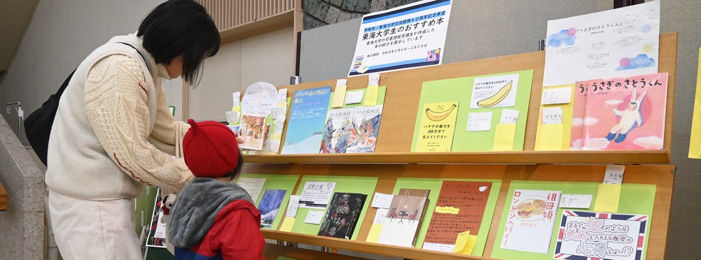 資格教育センターが開講する司書課程の授業を履修する学生たちが、2月1日から3月31日まで平塚市中央図書館で企画展示を行いました。平塚市と東海大学の交流提携40周年記念事業「東海大学生による平塚市図書館資料の紹介POP及びサービス活用案の展示」として、学生による企画制作物を同館1階の展示スペースに設営。期間中は多くの利用者が観覧しました。