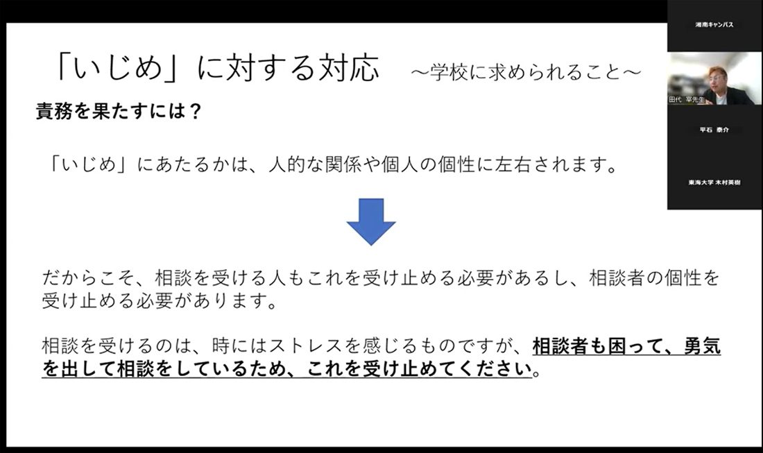 田代弁護士は「いじめ問題について」をテーマに講演。実際の学校で起きたいじめ問題を例に法律面から具体的な対応策について紹介し、「いじめ問題に関する法律は民法やいじめ防止対策推進法、刑法などが挙げられます。さらに文部科学省からいじめ防止等のための基本的な方針、いじめの重大事態の調査に関するガイドラインなどが策定されており、学校関係者は目を通しておくべきです」と説明したうえで、いじめの定義やこれまで起きたいじめに関する社会問題、いじめの認定の状況、学校に求められるいじめ対策について解説しました。さらに「実際にいじめが起きた際に、学校や自治体の基本方針に基づいた対応ができるよう、具体的に誰が、何を、どうするのか、すぐに判断して話をできるよう備えなければなりません。いじめは人的な関係や個人の個性に左右されますが、相談者は勇気を出して相談しているので、受ける人も相談者の個性を受け止めなくてはなりません」と強調しました。質疑応答では、「勇気が出ず相談に行けないという学生にどのように声をかけるべきでしょうか」「実際のケースにおける学校側の対応の例を知りたい」といった質問が挙がり、田代弁護士が一つひとつ丁寧に回答しました。