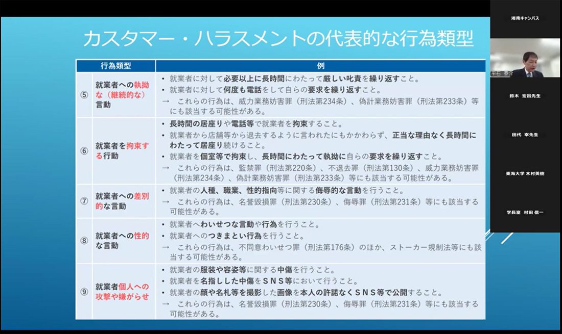 法学部の鈴木准教授は、「ハラスメント行為の再確認」と題し、教職員間や教員の学生に対する態度に焦点を当てて講演。「私たち一人ひとりが職責を自覚し、お互いを高め合って働きやすい環境をつくっていかなくてはなりません」と語り、さまざまな種類のハラスメントに関する具体的な定義や、事前の予防に向けた教育・研修の重要性を説明。「ハラスメント防止のために、ハラスメントをよく理解し、相談者に寄り添い困っている問題の解決に向けて部署や学科内などで検討を続けることが大切です」と語りました。続いて理事長室法務担当の戸倉課長は、「カスタマーハラスメント」について語り、法律上の位置づけをはじめ、防止措置の義務、学校法人東海大学におけるハラスメント防止に関する規程、事業主側の責任などの事例を紹介。「本学園ではハラスメントを絶対に許さない姿勢を示すためにも明確な方針を定めており、カスタマーハラスメントについても教職員の皆さんの協力も得て対応策を拡充し、さらに働きやすい環境づくりを推進していきます」と話しました。また、「本学のハラスメント防止体制」についてハラスメント防止人権委員会事務局からも説明。全学的な体制と相談員制度、外部相談窓口について紹介しました。最後に学長室の村田信一部長が「本日の各講演は学園の各部門で起こり得る事態に即しており、我々教職員が当事者になるものだと感じました。自分一人で抱え込まず、組織的な対応が重要です」とまとめました。