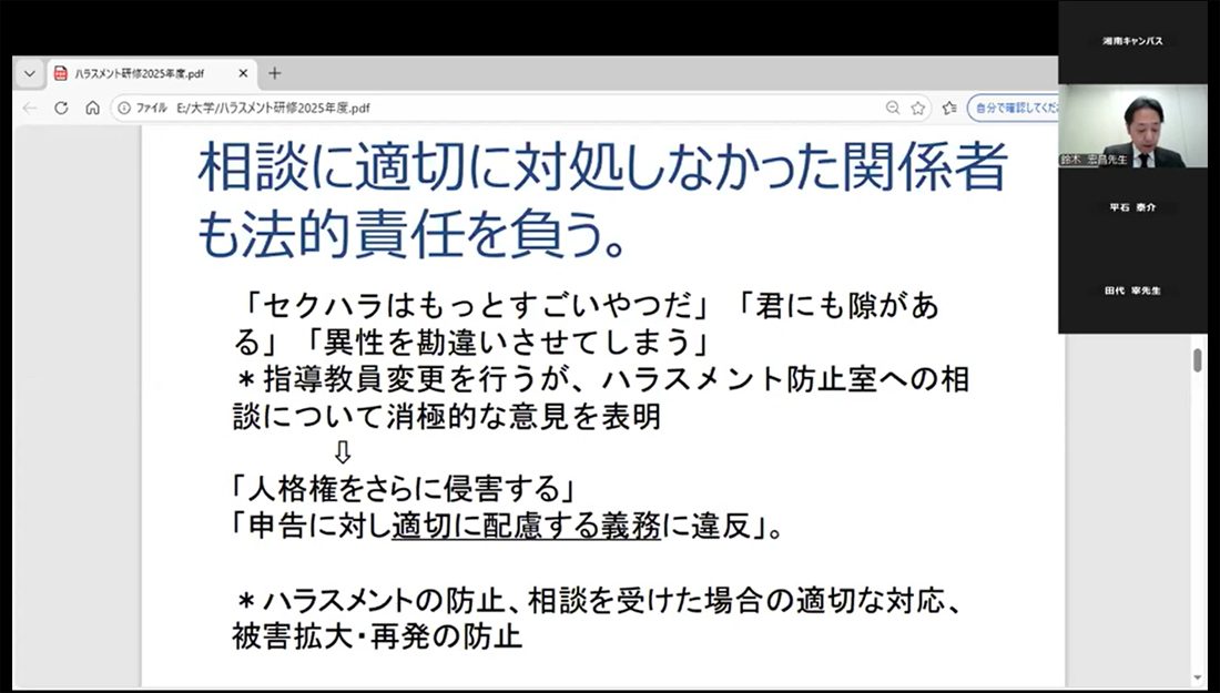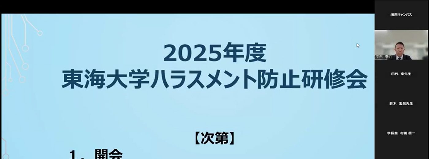 東海大学では3月27日にオンラインで、「2025年度東海大学ハラスメント防止研修会」を開催しました。本学法学部卒業生、法科大学院修了生で春水法律事務所の田代宰弁護士、本学ハラスメント防止人権委員会委員長の法学部・鈴木宏昌准教授、学校法人東海大学理事長室法務担当の戸倉秀二課長が講演。学園の初等中等教育機関の教職員も含めた298名が参加しました。
