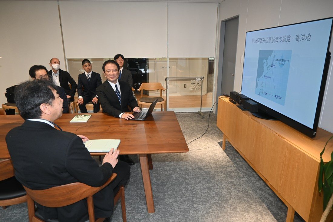 10日の報告会では、研修団の大江一平団長(法学部教授)と中村隆志副団長(政治経済学部准教授)、海外研修航海実行委員会委員長の岡田工実行委員長(理系教育研究センター教授・学長室部長)に、団役員と研修学生が作成した報告書を提出しました。大江団長はスライドや写真を使って航海の様子を紹介し、「寄港地では現地の方々に熱烈な歓迎を受け、学生たちは非常に感動していました。教職員や東海大学後援会の皆さまをはじめ、多くの方に支えていただきながら、勉強にも遊びにも全力で取り組み、大きな成長を遂げた32日間になったと思います」と成果を語りました。