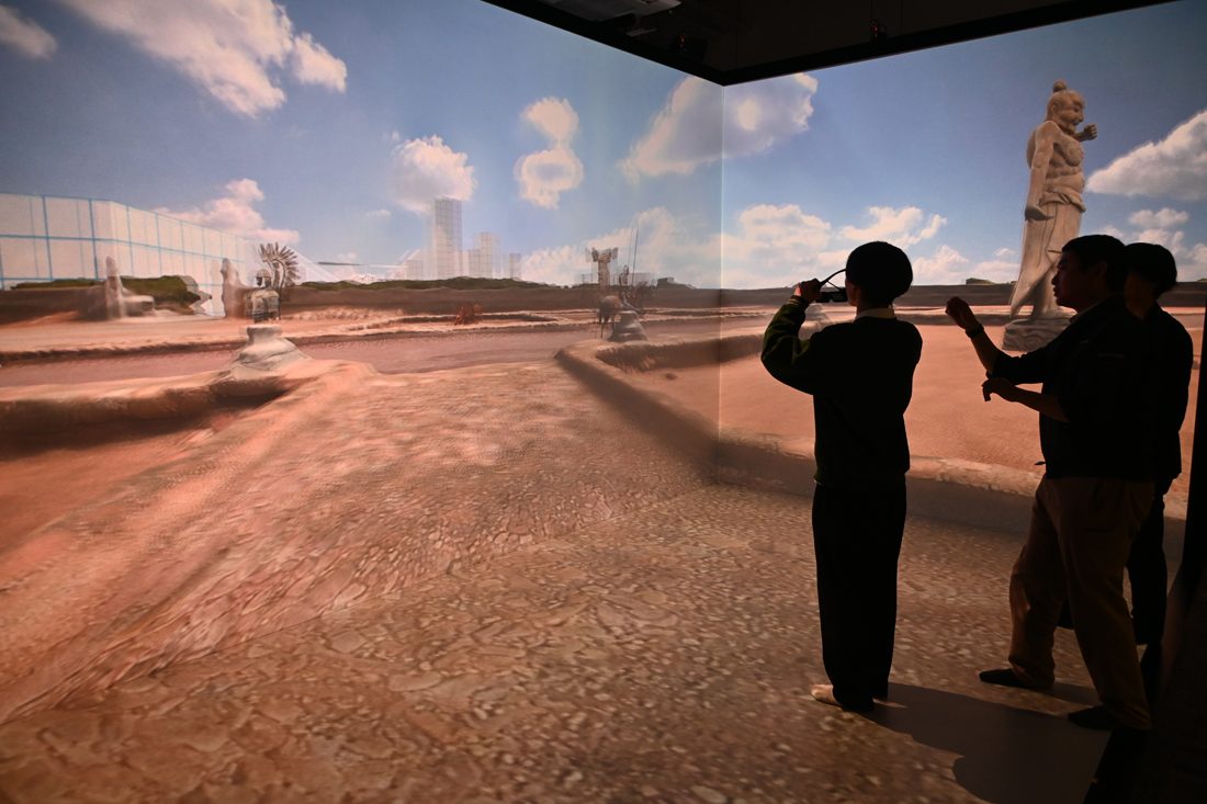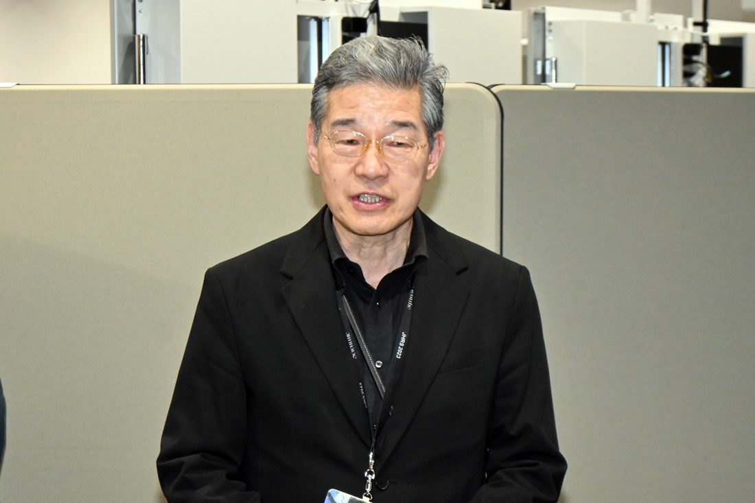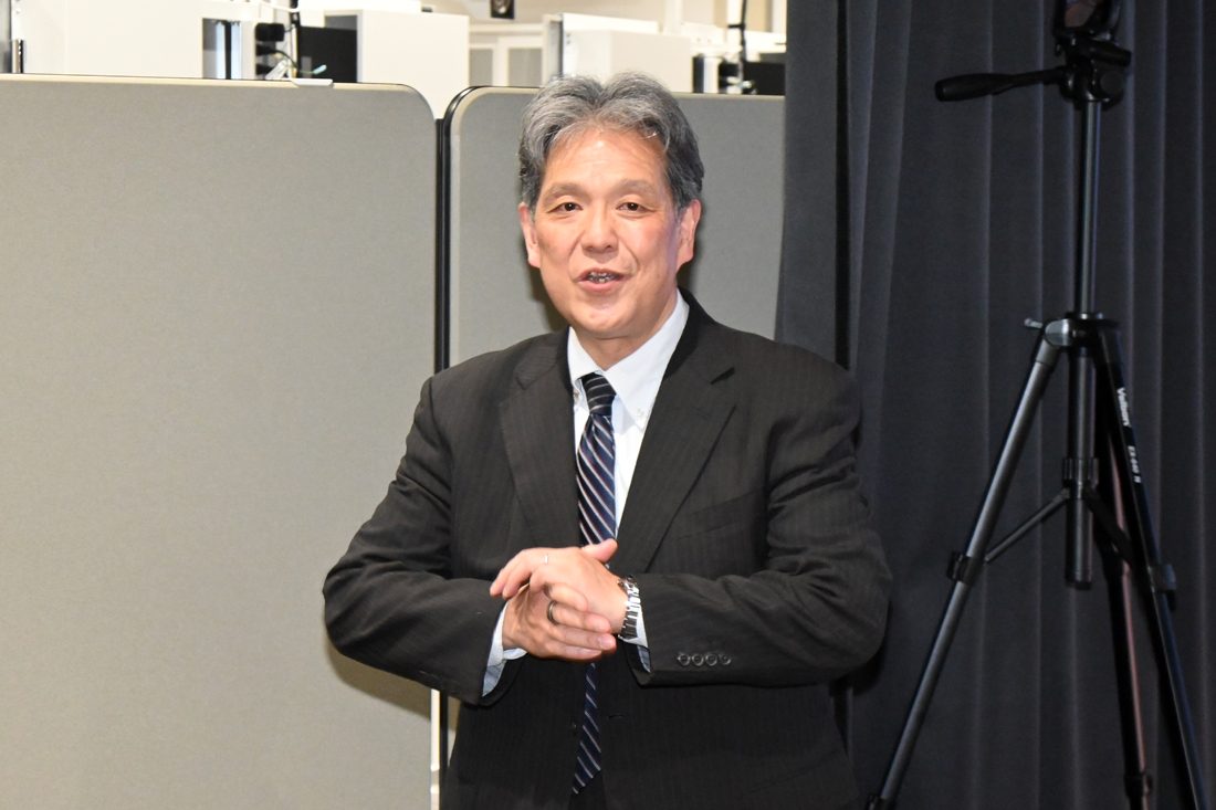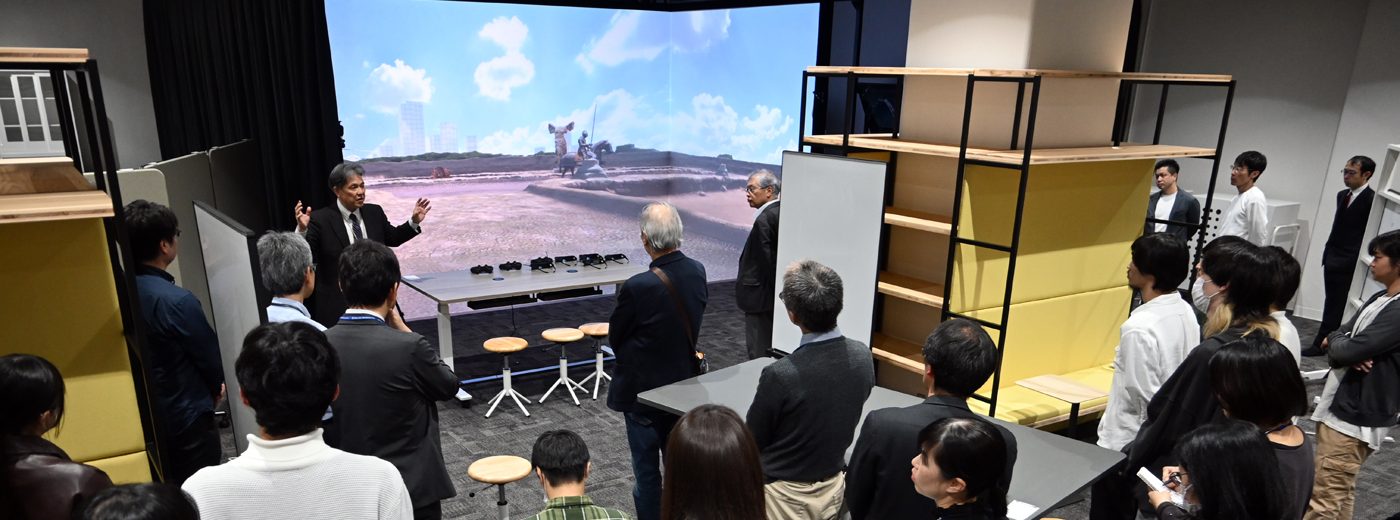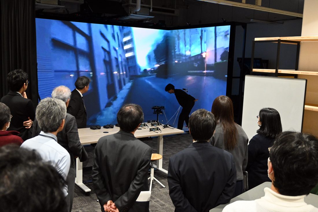内覧会では、情報理工学研究所の黒田輝所長(情報理工学部教授)が施設の概要を説明した後、VR研究が専門の濱本和彦副学長(同)が、バーチャル空間の投影やVR-Commonsの操作を実演しました。来場者は迫力ある映像と没入空間に驚きながら、それぞれの研究分野での活用方法について意見を交わしていました。濱本副学長は、「オンライン会議では顔は見えていても空間そのものは共有されていません。一方でVR-Commons内では複数人が同じ空間に入り、全身が見える状態で身振り手振りを交えてコミュニケーションを取ることができ、その場の空気感や雰囲気も伝わりやすくなります。拠点間通信を前提としたVR環境において、どの程度リアルに近いコミュニケーションが成立するのか検証していきたい」と語りました。また、「本学は全国にキャンパスを展開しており、学生や教員が多様な分野の研究に取り組んでいます。空間共有が進めば教育・研究交流がいっそう活発になると期待しています。将来的には各キャンパスのラーニングコモンズへの展開も視野に入れ、学生間交流の促進にもつなげたい。まずは湘南キャンパスを拠点に研究を進め、本学の総合力向上と社会貢献につなげていきます」と話しました。