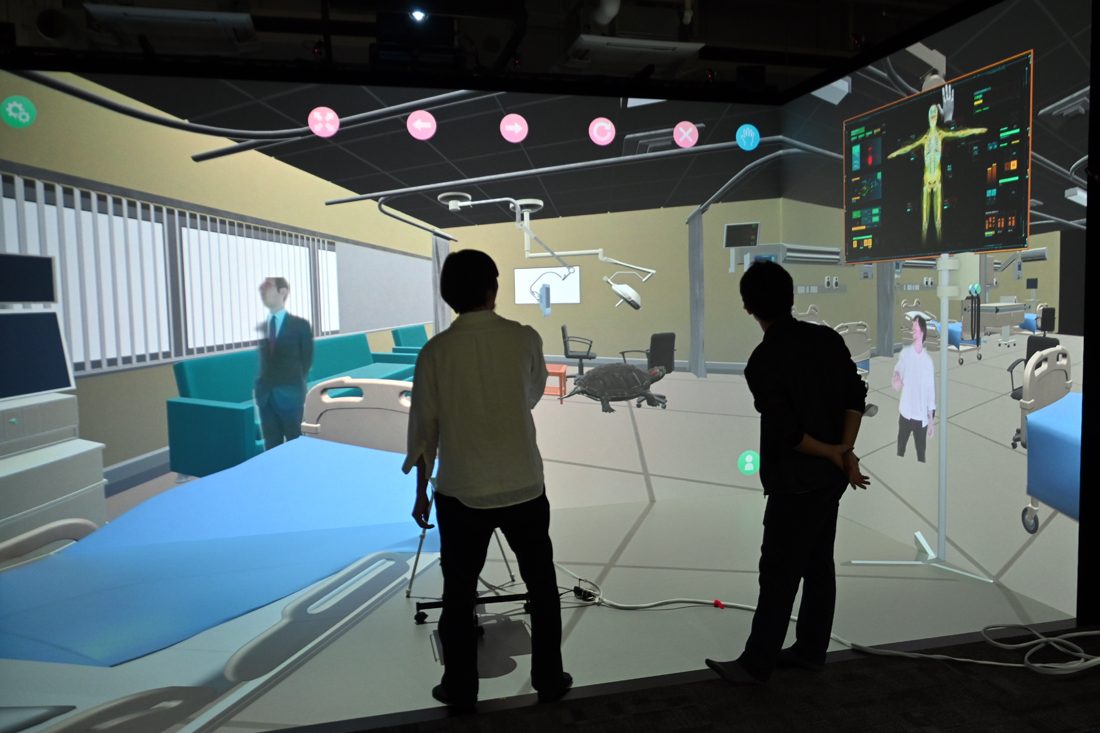 設置されたIVEは、正面・床面・右面に大型スクリーンを配置し、体験者がその場に入り込んだような没入感を得られる構造です。上部に設置したセンサーで体験者の動きを検知し、立体映像が体験者の視点に応じて最適化され、違和感のない立体空間が体験できます。さらに、このIVEに同時に導入されたソフトウェア「VR-Commons」含めた同様の設備を拠点間通信に関する研究の促進を目的に、本キャンパス19号館にも設置。空間同士を接続して新たな学習やコミュニケーションの形の創出を目指します。