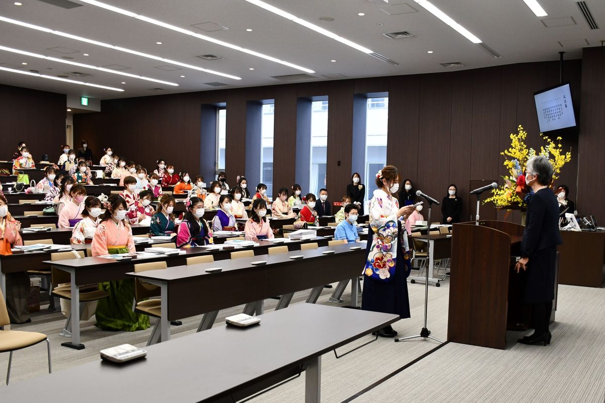 25日の午前中は、学部の再編により26年間の幕を閉じ、今年度が最後の学位授与式となる健康科学部看護学科と同社会福祉学科がそれぞれ式典を実施。各学科長が学位記を授与しました。沓澤智子学部長は、「看護や介護などの現場でプロフェッショナルとして活躍するために、自分自身の努力で学び、成長し続けてほしい」と語りました。山田学長は、「皆さんは健康科学部の最後の卒業生となりますが、看護学科は医学部看護学科、社会福祉学科は健康学部健康マネジメント学科として、皆さんのDNAを継承していきます。学部学科の名称が変わっても東海大学は皆さんを温かく見守り続けます。4年間で培った力をそれぞれの分野で十分に発揮してください」と激励しました。総長賞を受賞した看護学科の佐々木涼香さんと健康科学部長賞を受賞した同・栁原佐友里さんは卒業生を代表し、「東海大で得た知識と経験を糧に、人として、看護職として成長できるよう精進していきます」「新型コロナ禍で医療者と学生の両方を経験できたことを財産として、今後に生かします」とあいさつ。総長賞を受賞した社会福祉学科の岸あかりさんは、「4月には東海大の大学院健康科学研究科保健福祉学専攻に進学します。保健医療福祉に関する学びを深め、社会に貢献したい」と意欲を見せていました。