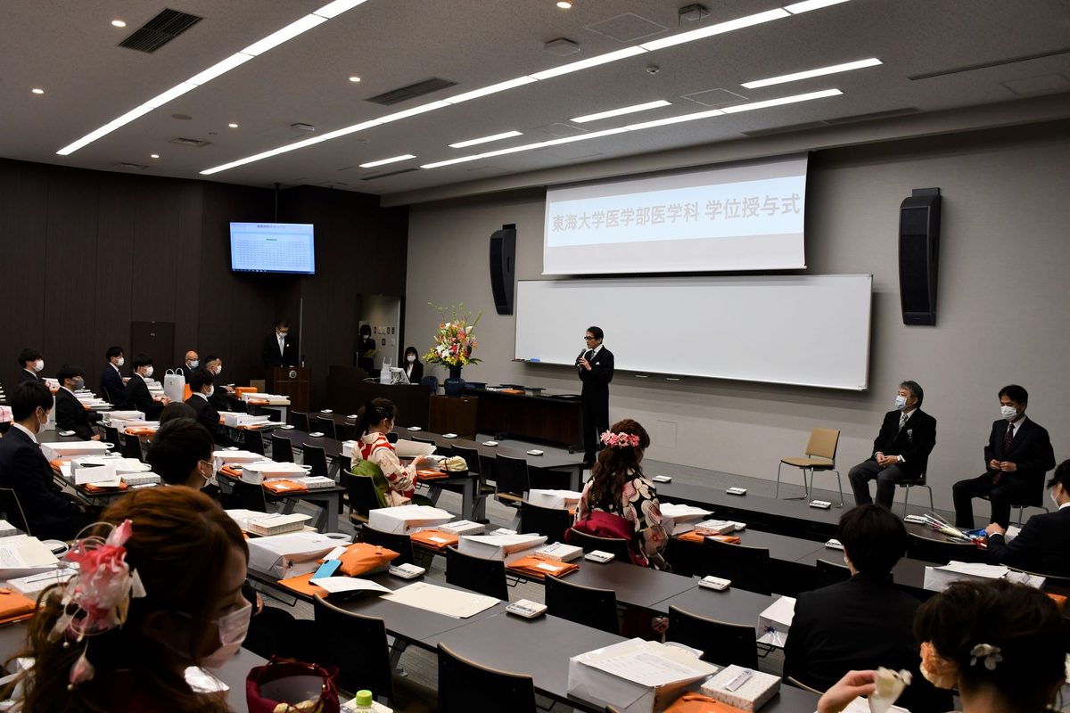 午後には医学部の学位授与式を実施。山田学長からのビデオメッセージでは、「コロナ禍の中、皆さんは医師として船出し、活躍することが期待されています。東海大の卒業生としての誇りをもってこの難関に立ち向かってください。ご健闘をお祈りしています」と期待が述べられました。卒業生に学位記を授与した坂部貢学部長(副学長・医系担当)は、「皆さんが手にした学位記は6年間の努力の証です。本学医学部での学びを誇りとして“良医”を目指すとともに、その魅力を後輩に伝えていってください」とエールを送りました。医学部長賞を受賞した学生は、「情熱をもって真剣に学生に向き合ってくれた教職員の皆さんに感謝します。先生方からは、専門知識はもちろん、医師としての覚悟や医療に取り組む姿勢を学びました。その一つひとつをしっかりと受け止め、“良医”になるべく努力を続けます」と力強く語りました。