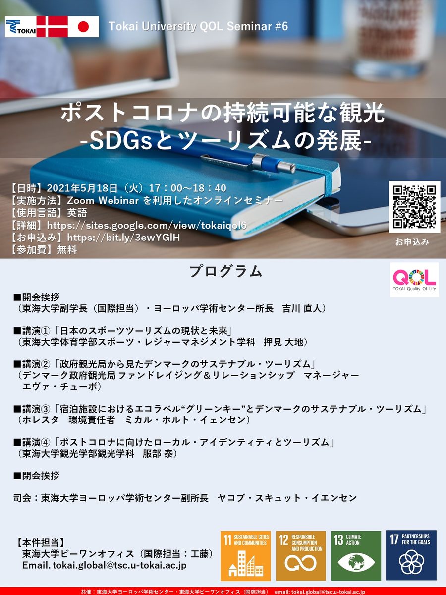 東海大学では人類のQOL向上を目指し、世界に共通するさまざまなテーマを取り上げ「QOLセミナー」を開催しています。第6回目となる今回は「観光・ツーリズム」に焦点を当てます。「観光・ツーリズム」は世界の主要産業の一つであり、地域社会の発展に向け重要な役割を果たしています。セミナーでは、日本とデンマークがコロナ禍で直面している問題や今後の課題を紹介しながら、我々が果たしていくべき役割について考えます。是非ご参加いただけますようご案内申し上げます。