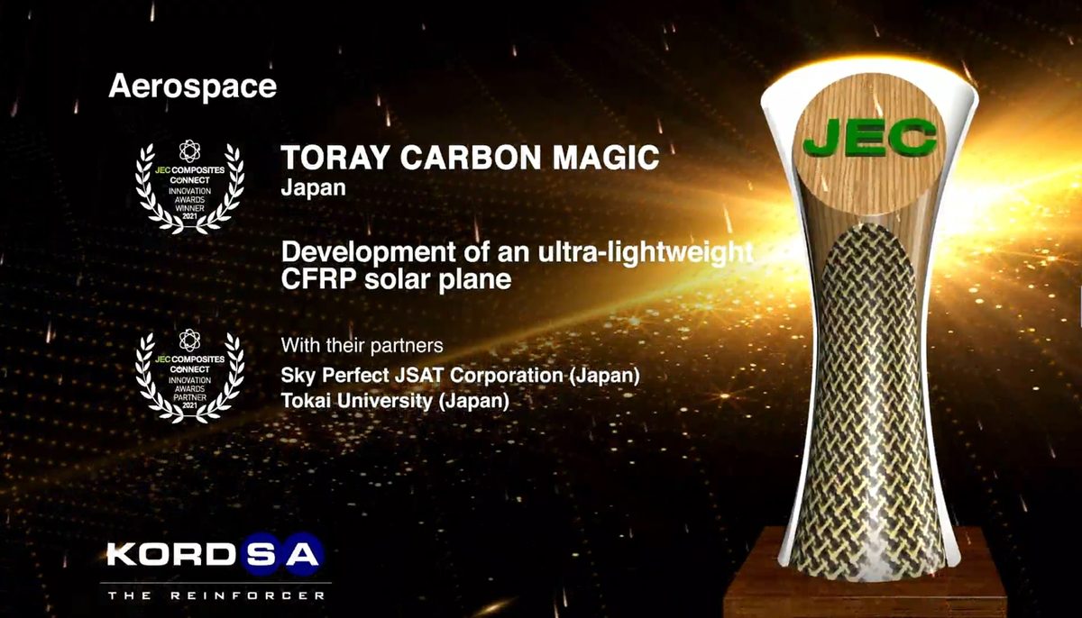 工学部航空宇宙学科航空宇宙学専攻の福田紘大准教授らが開発の中心を担った「超軽量CFRP(炭素繊維複合材料)ソーラー無人飛行機」(出展代表:東レ・カーボンマジック社)が、6月2日に複合材料の国際展示会「JEC WORLD」の代替イベントとして開催された「JEC COMPOSITES CONNECT」の「航空宇宙部門」で、「JEC Innovation Award 2021」を受賞しました。本学は共同パートナーとしての受賞になります。JEC WORLDは例年3月にフランス・パリで開催される世界最大規模の複合材料展示会。展示カテゴリーには、「自動車」「建築・建設・インフラ」「設備機器」「航空宇宙」などがあり、各カテゴリーからJEC Innovation Awardが選出されます。昨年と今年は新型コロナウイルス感染拡大の影響から中止が決定し、今年は6月にオンラインでの代替イベントとして「JEC COMPOSITES CONNECT」が開催されました。