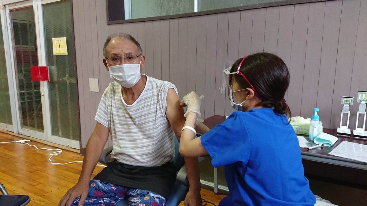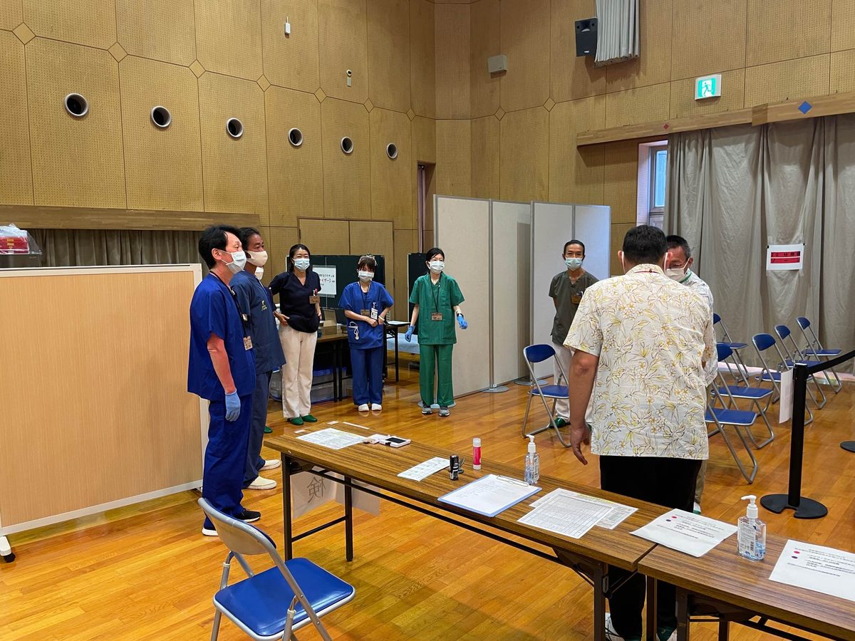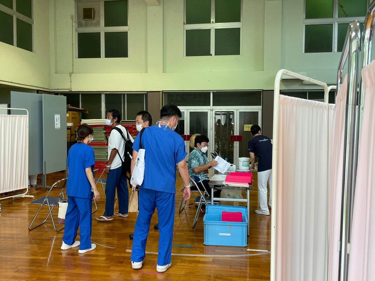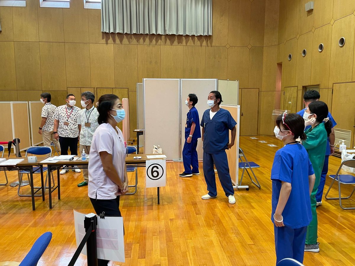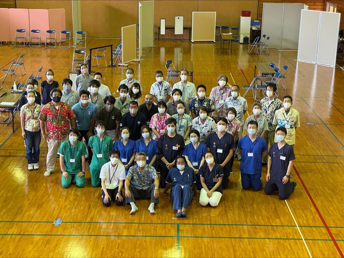 7月28日(木)、1日目のワクチン接種が始まりました。今回のワクチン接種チームには、付属病院病院長の渡辺先生も加わり、島民96名に接種を終えました。2日目は300名を接種予定で、その翌日には、母島へ向かいます。