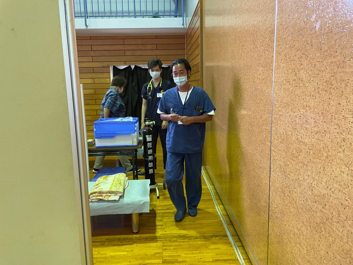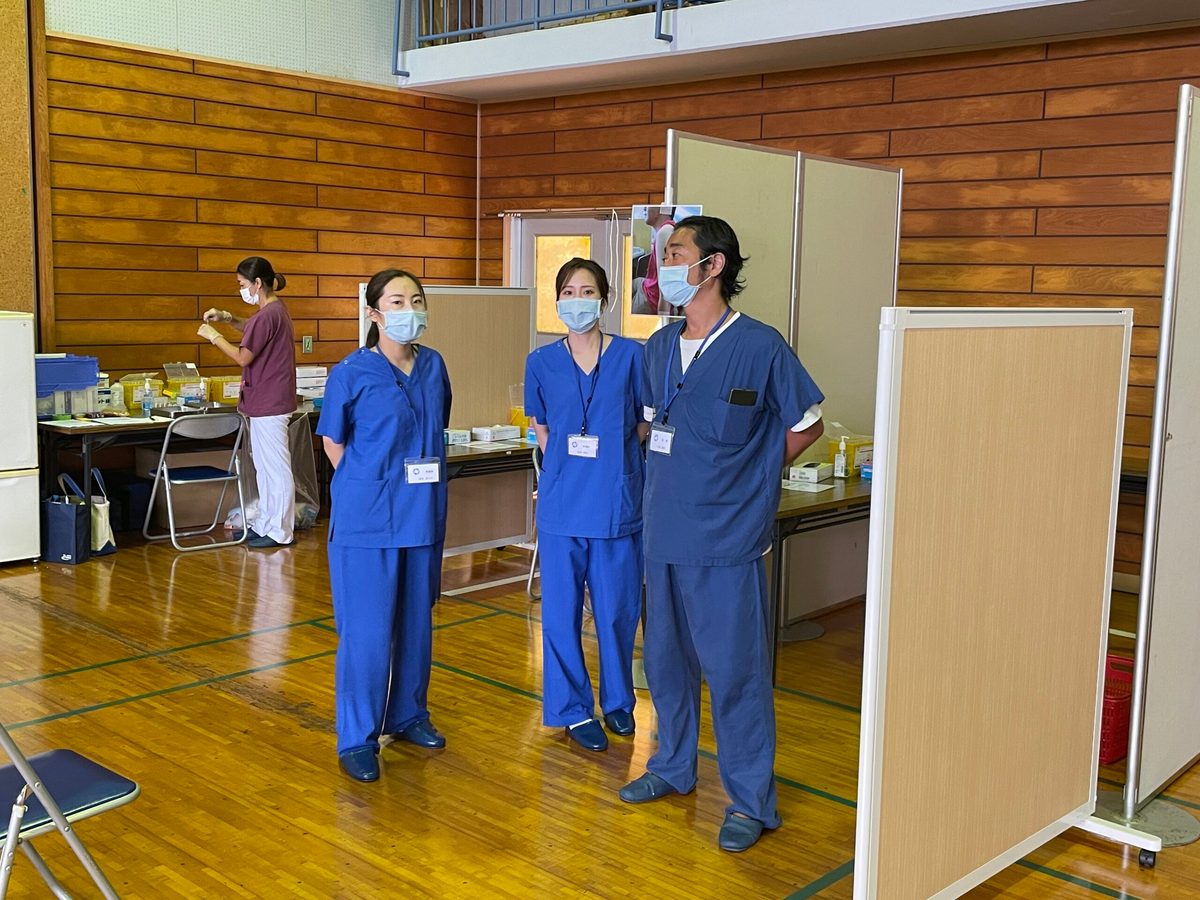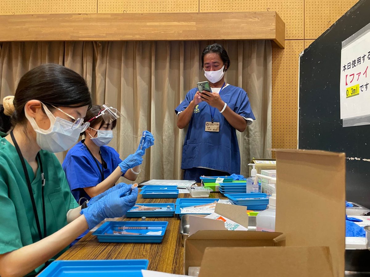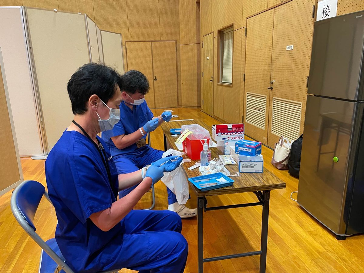 7月28日(木)、1日目のワクチン接種が始まりました。今回のワクチン接種チームには、付属病院病院長の渡辺先生も加わり、島民96名に接種を終えました。2日目は300名を接種予定で、その翌日には、母島へ向かいます。