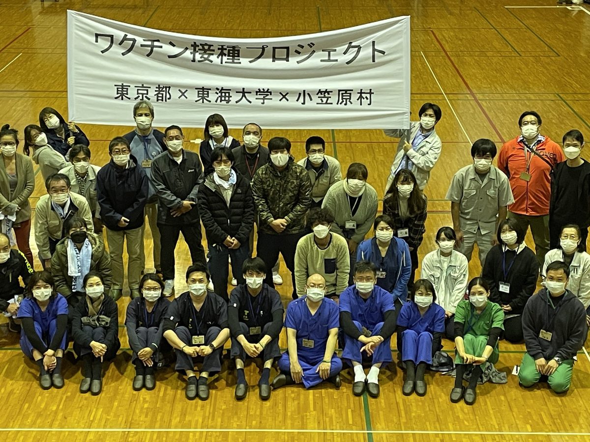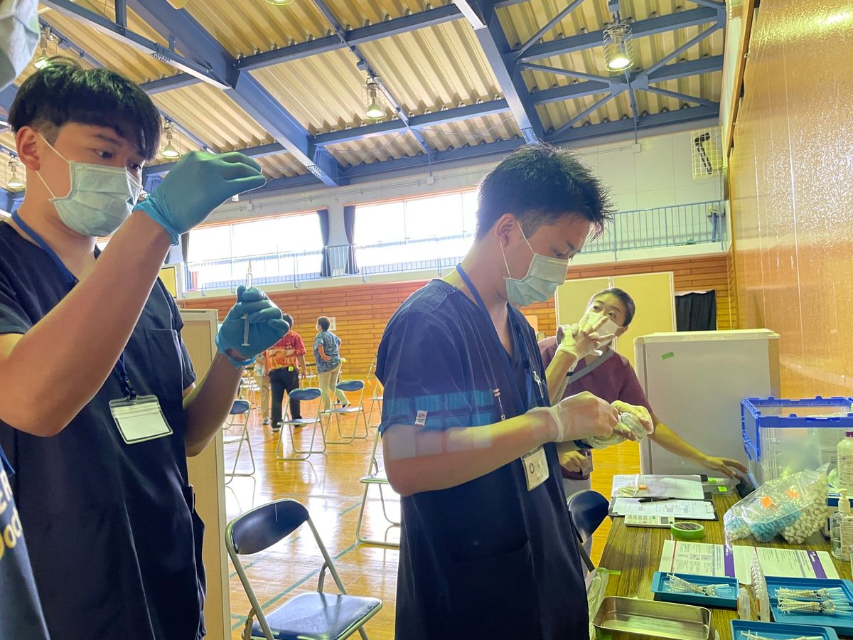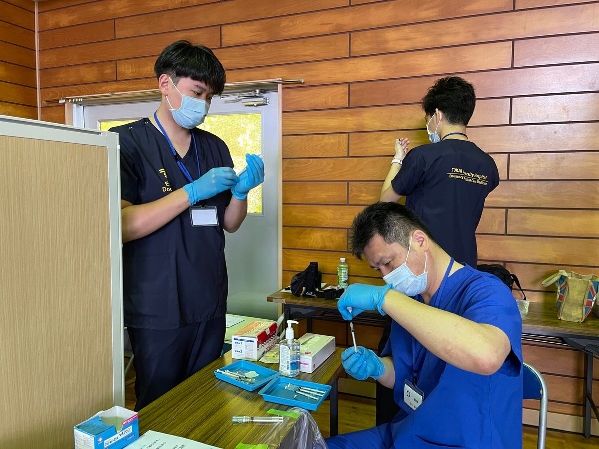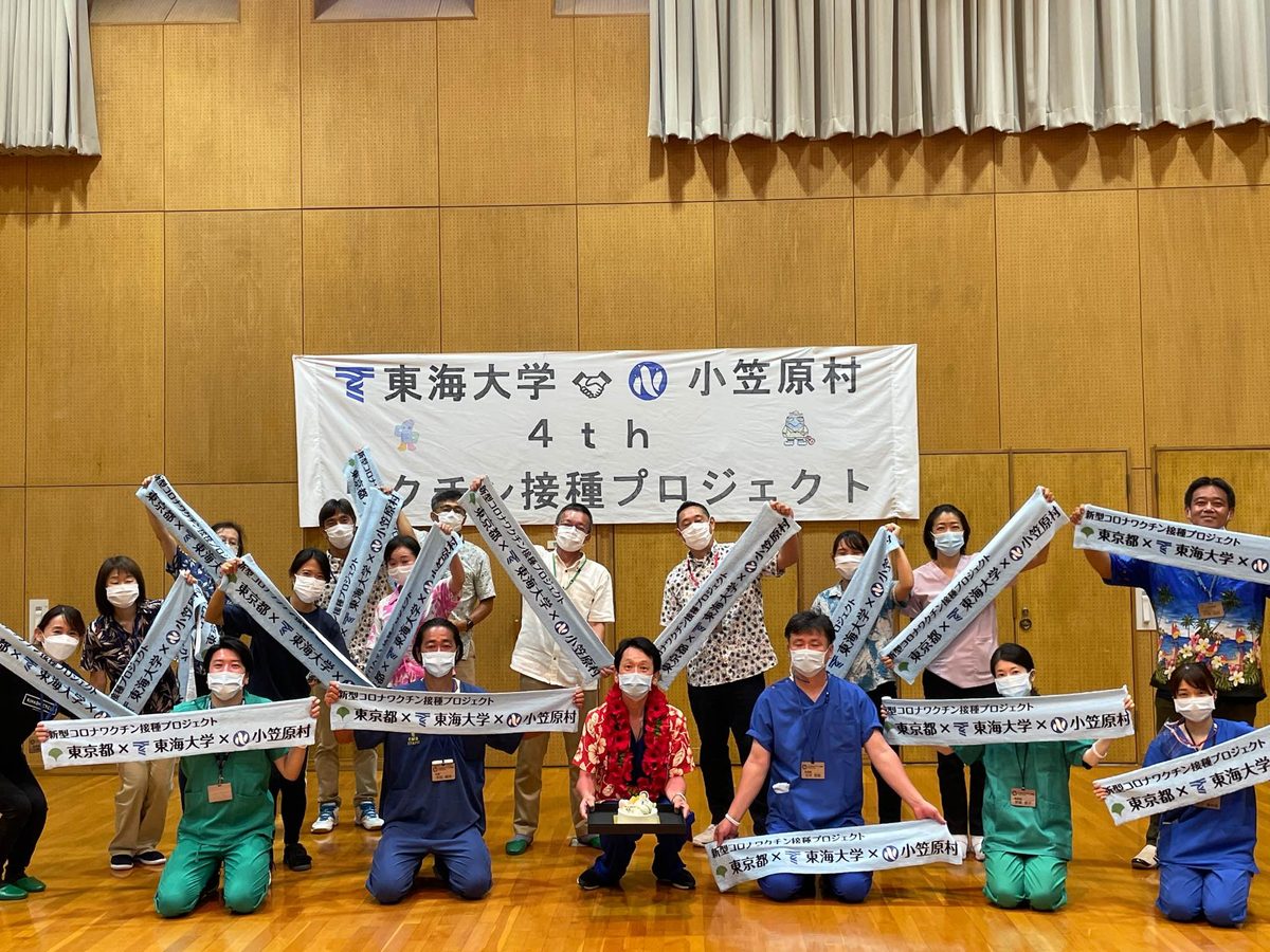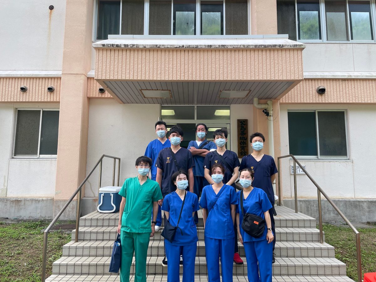 7月28日(木)、1日目のワクチン接種が始まりました。今回のワクチン接種チームには、付属病院病院長の渡辺先生も加わり、島民96名に接種を終えました。2日目は300名を接種予定で、その翌日には、母島へ向かいます。