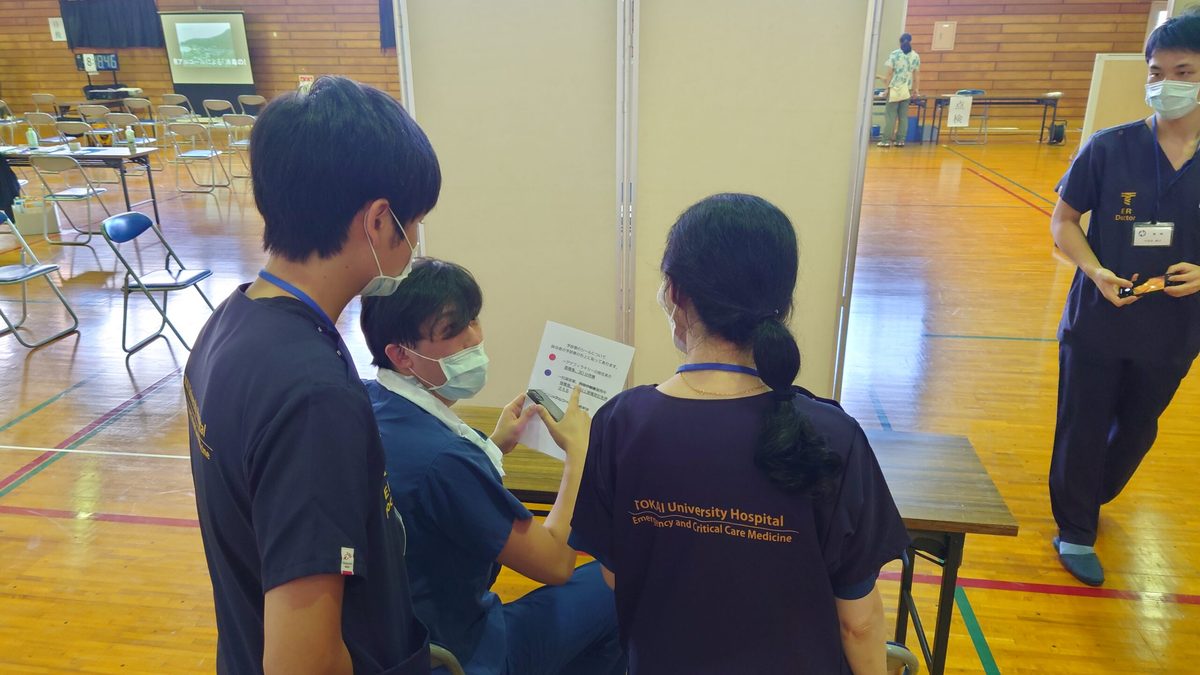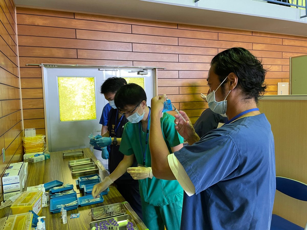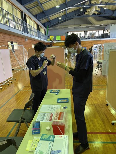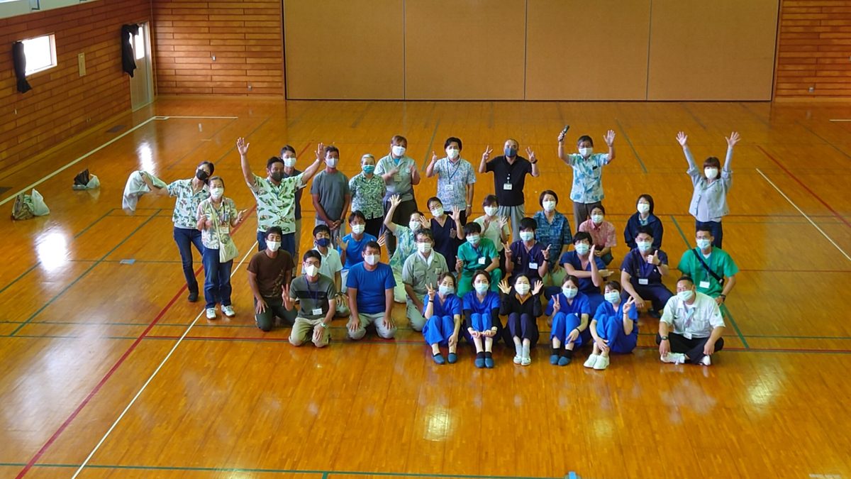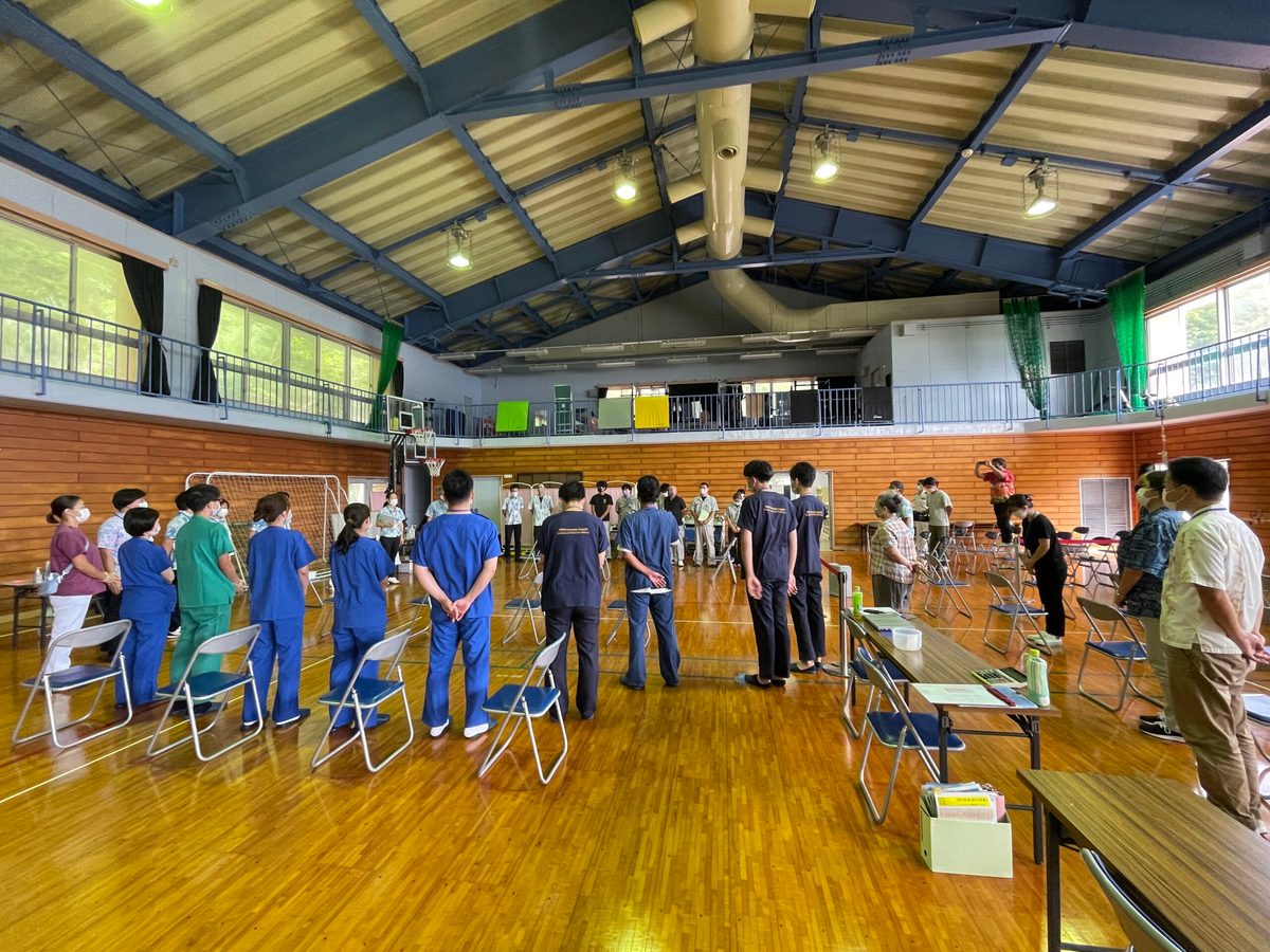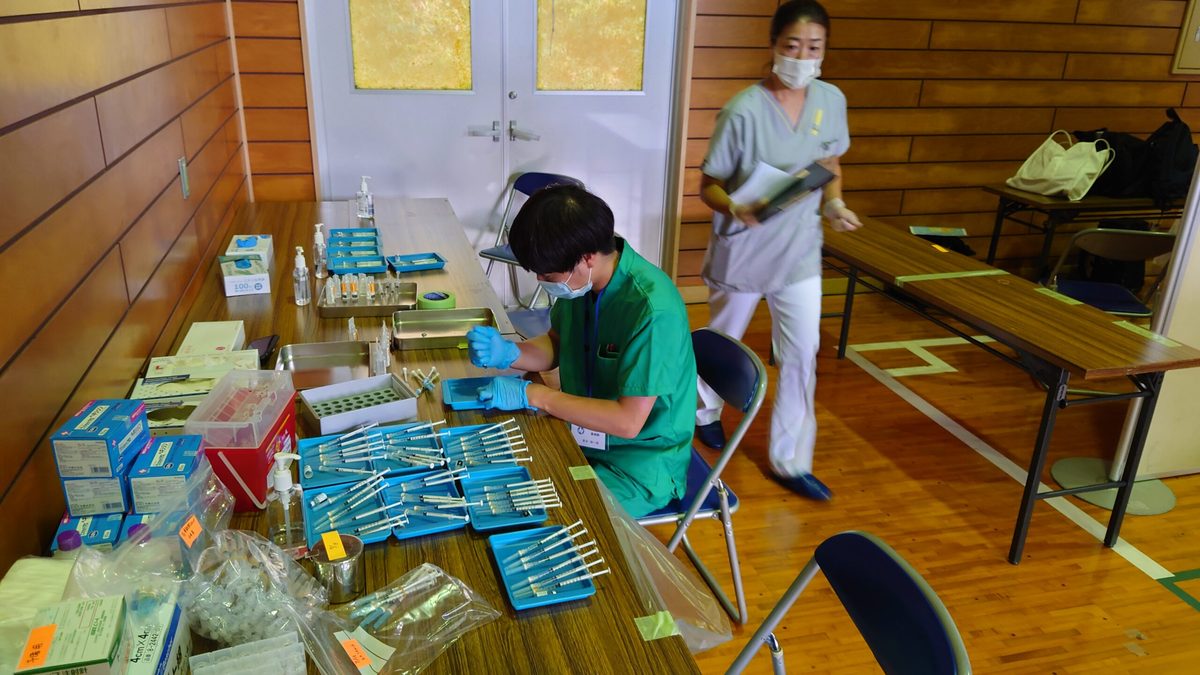 7月28日(木)、1日目のワクチン接種が始まりました。今回のワクチン接種チームには、付属病院病院長の渡辺先生も加わり、島民96名に接種を終えました。2日目は300名を接種予定で、その翌日には、母島へ向かいます。