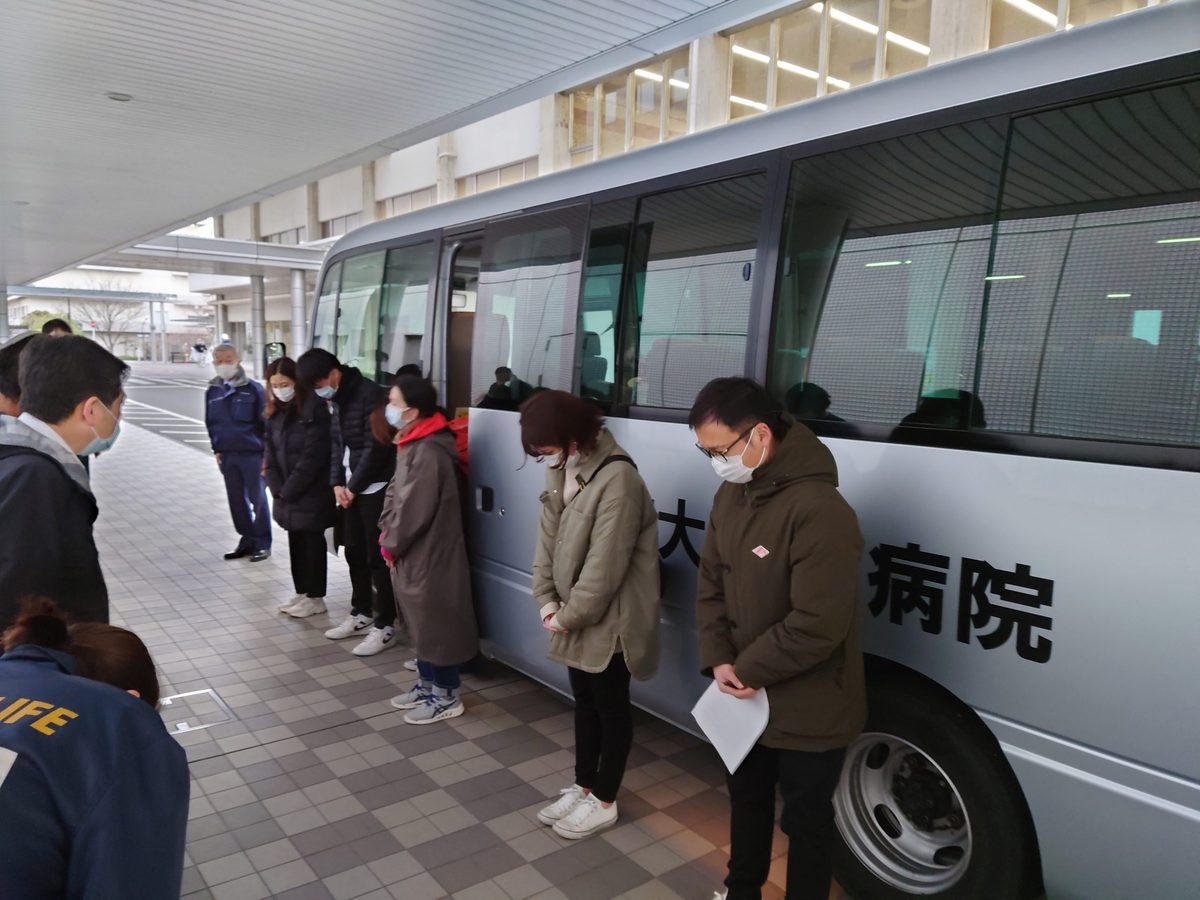 付属病院群から派遣された医療チーム10名を乗せた望星丸は、本日朝9時に無事清水港に帰港しました。帰港から間もなく、伊勢原行のバスに乗り込んだチーム一行は11時30分に伊勢原校舎に到着して、飯田本部長、渡辺病院長をはじめ、スタッフの出迎えを受けました。