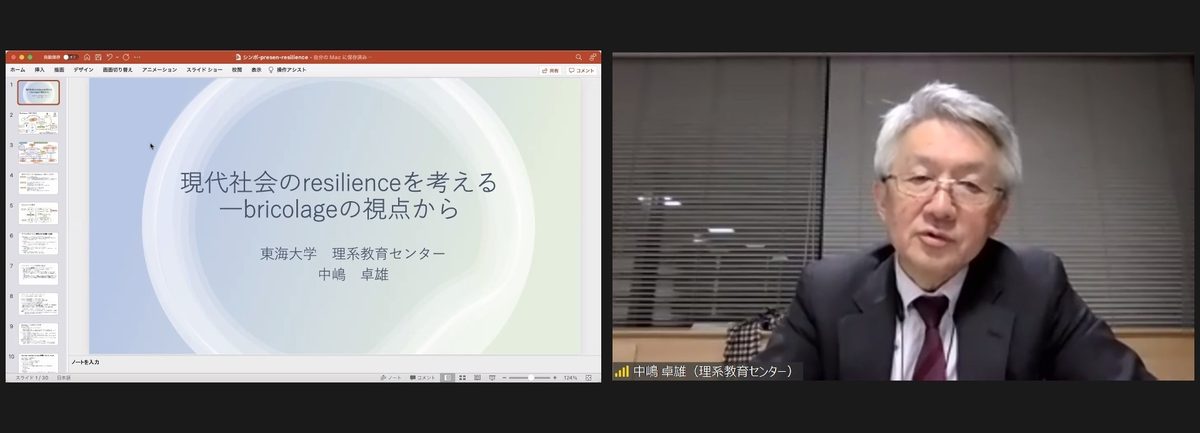 関連研究報告では中嶋教授が、「現代社会のresilienceを考える―bricolageの視点から―」をテーマに講演。地震や感染症といった大きな環境の変化に人はどう立ち向かい、何を契機として、どのようにレジリエンス(resilience=回復)的な行動をとるのかを、近年、アントレプレナーシップの危機対応として語られているブリコラージュ(bricolage)に注目して考察しました。中嶋教授は、ブリコラージュを、「すでに持っているものだけでなく、今まで利用していなかった多様な要素を活用するなど、内部資源と外部資源を結び付けること」と説明し、その意義や活用事例を解説。また、自身が体験した2016年の熊本地震における現場の状況を振り返り、ブリコラージュの視点は臨機応変な対応が求められる複雑な環境下でも生かされると語りました。最後に、人間の活動や生態系が均一化に向かっていると指摘し、「ブリコラージュ的な発想や活動を行うとともに、時間的な推移や因果関係を把握しながら生態系へのかかわり方を考え、多様性の回復を目指すべきではないか」と述べました。