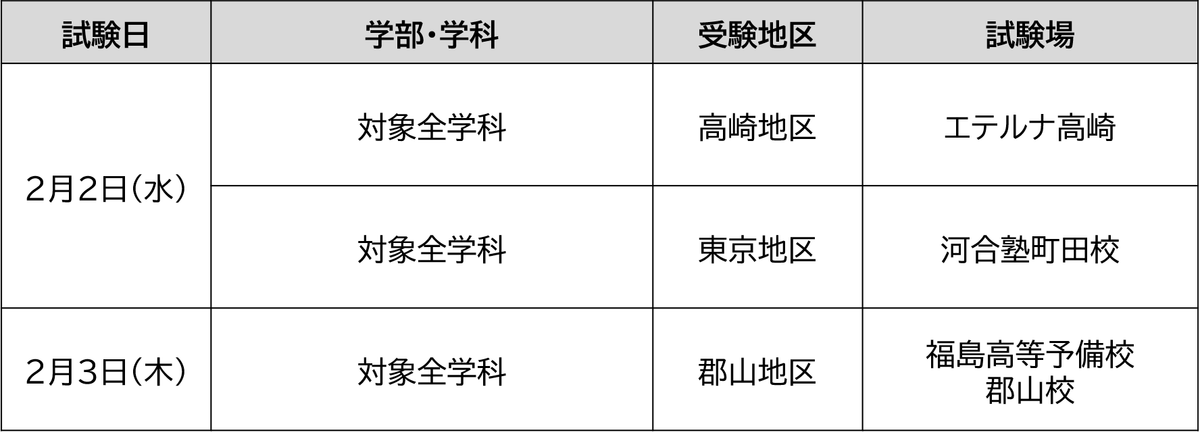 設置している「受験地区・試験場」につきましては、入学試験要項をご参照ください。