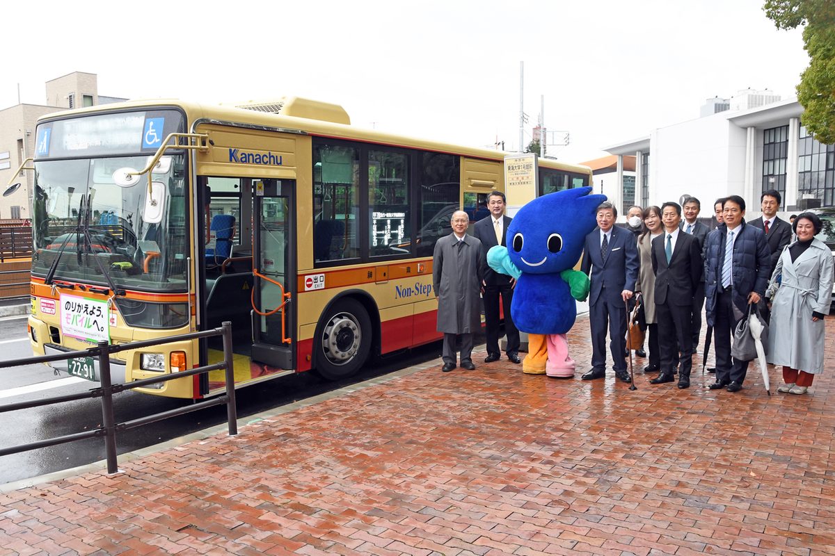 運行初日の8時50分ごろ、東海大学1号館前バス停では山田清志学長や本学が育成する4つの力を表現したイメージキャラクター「リッキー」、多数の教職員が第1便を出迎えました。山田学長は、「念願の直通バスが走ることになり、いま第1便が無事に到着しました。これからたくさんの学生や皆さんに利用していただけることでしょう」と語りました。