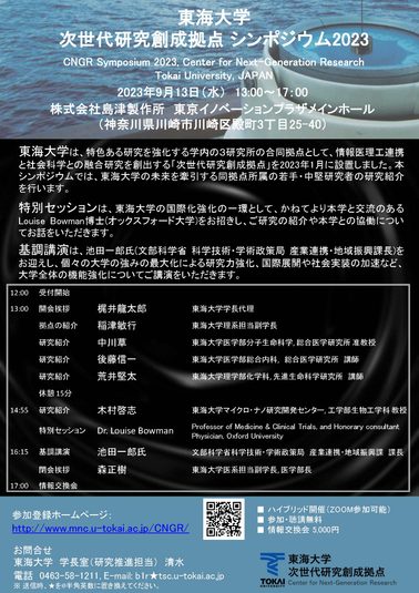 本シンポジウムでは、拠点に所属する若手研究者4名の研究紹介に加え、医工連携研究で本学にゆかりのあるオックスフォード大学のLouise Bowman教授をお招きし、研究のご紹介や本学との共同研究内容をご講演いただきます。また、地域中核・特色ある研究大学の強化促進を支援されている文部科学省科学技術・学術政策局 産業連携・地域振興課の池田一郎課長をお迎えし、最近の政策動向から個々の大学の強みの最大化による研究力の強化等についてご講演をいただきます。