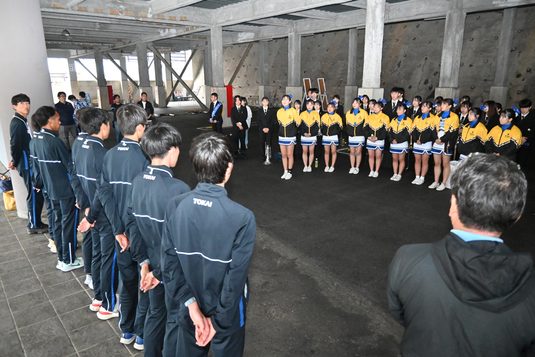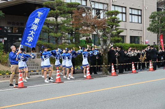 両角速駅伝監督(スポーツプロモーションセンター教授)は、「エースの石原翔太郎(体育学部4年次生)や主将の越陽汰(同3年次生)ら主力の多くを故障で欠き、下級生主体のオーダーで臨みました。序盤の悪い流れを変えられなかったものの、一昨年度は12位、昨年度は10位と悔しい結果が続いていた中で、一桁順位でゴールできたのは、今後につながると考えています。1月の箱根駅伝でも10位以内に入り、次こそシード権を獲得したい」と抱負を語りました。南坂選手は、「10月14日の箱根駅伝予選会を終えてから、しっかり疲労を抜いて臨んだつもりでしたが、実際に全日本を走ってコンディション調整が甘かったと痛感しました。箱根駅伝でリベンジを果たせるよう練習に励み、チームに貢献したい」と話しています。なお、当日は湘南キャンパスの応援団、チアリーディング部、吹奏楽研究会が駆けつけ、沿道から声援を送りました。