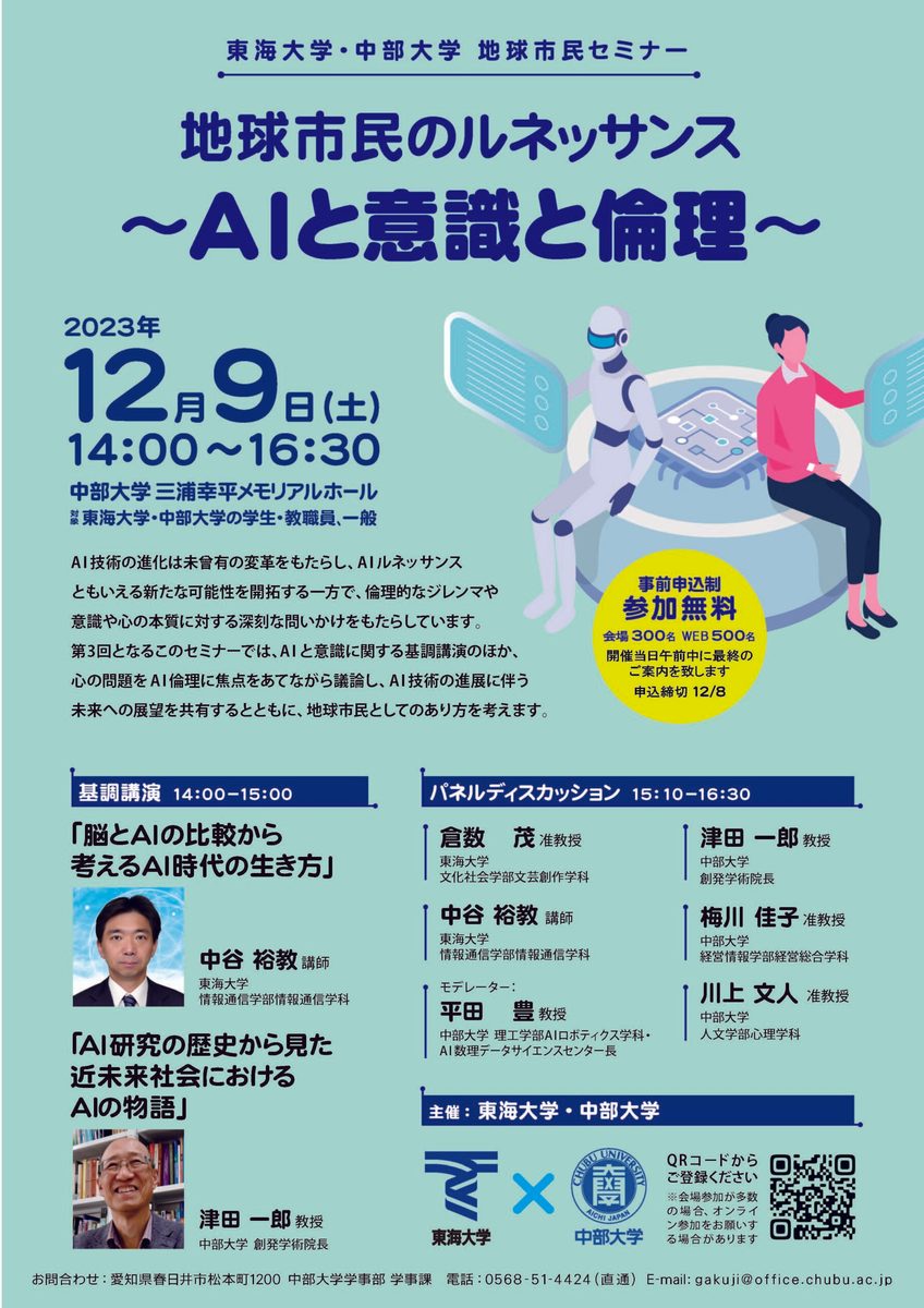 東海大学・中部大学主催の地球市民セミナー「地球市民のルネッサンス~AIと意識と倫理~」が、12月9日(土)中部大学 三浦幸平メモリアルホールおよびオンラインで開催されます。