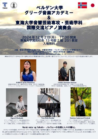 ノルウェーのベルゲン大学グリーグ音楽アカデミーと東海大学音響芸術専攻・芸術学科による国際交流ピアノ演奏会を開催します。ベルゲン大学と東海大学は学術協定を締結しており学生交流を進めておりますが、このたび、ベルゲン大学より三名が来日し本学の学生とピアノを奏でます。入場無料、入退場自由ですのでぜひ足をお運びください。