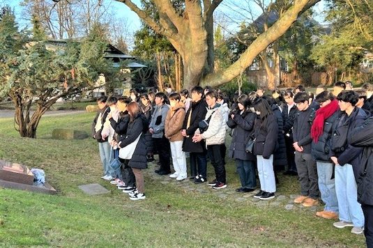 生徒たちは、TUECの敷地内にある記念碑に献花をした後、2グループに分かれてヤコブスキュット・イエンセン事務長とスタッフのガイドで庭園や敷地を見学しました。さらに、堀真奈美所長が、本学の欧州拠点となるTUECの役割、本学の建学の思想のルーツでもあるデンマークとの関係性についてレクチャーしました。