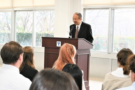 修了式では、語学教育センター留学生支援教育学系副主任の外崎淑子教授が修了した協定留学生の内訳を報告。語学教育センターの宮崎啓センター長が、「日本語は数ある語学の中で特に難しいとされていますが、皆さんはたゆまぬ努力で習得されました。その努力を誇りに思います。これから日本を離れて世界に羽ばたいていきますが、日本に戻ってくることもあるかもしれません。東海大学はいつでも皆さんの帰りを待っています」と語りかけました。続いて学長室国際担当の小山晶子部長(国際学部教授)が登壇し、「東海大ではこの先10年をかけて、海外留学をする学生と留学生を受け入れる人数を今の10倍に増やしたいと考えています。留学生の輪を広げるためにも、帰国後はぜひ周りの人にたくさん東海大の話をしてください」と呼びかけ、宮崎センター長と小山部長から学生一人ひとりに修了証が手渡されました。式の最後には各プログラムの学生たちが、日本で親しんだけん玉を披露したり、日本での留学生活を振り返るスピーチをしたりと、学びの成果を報告しました。