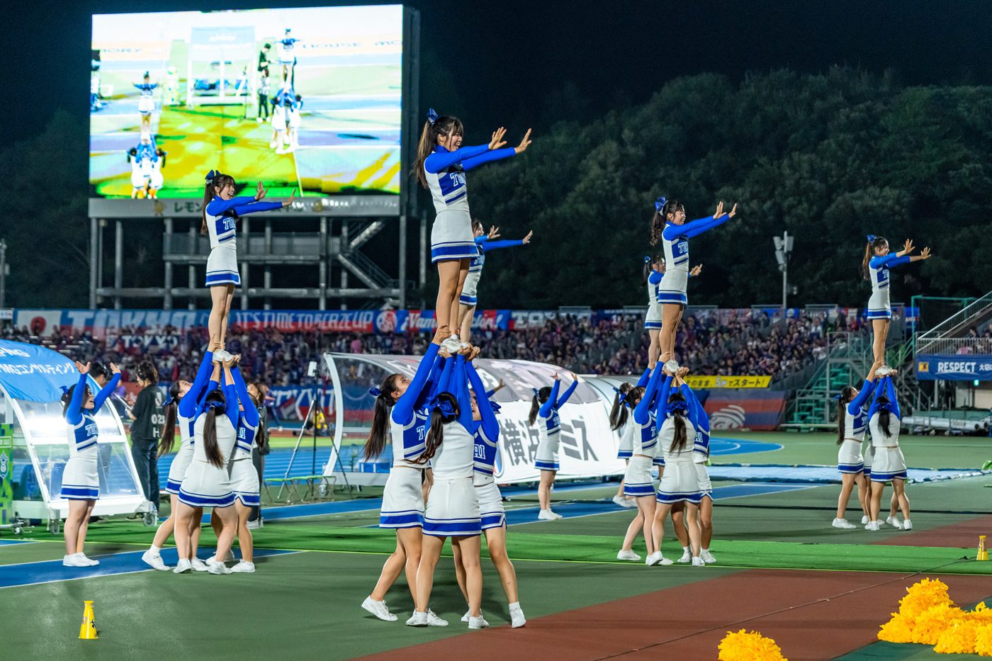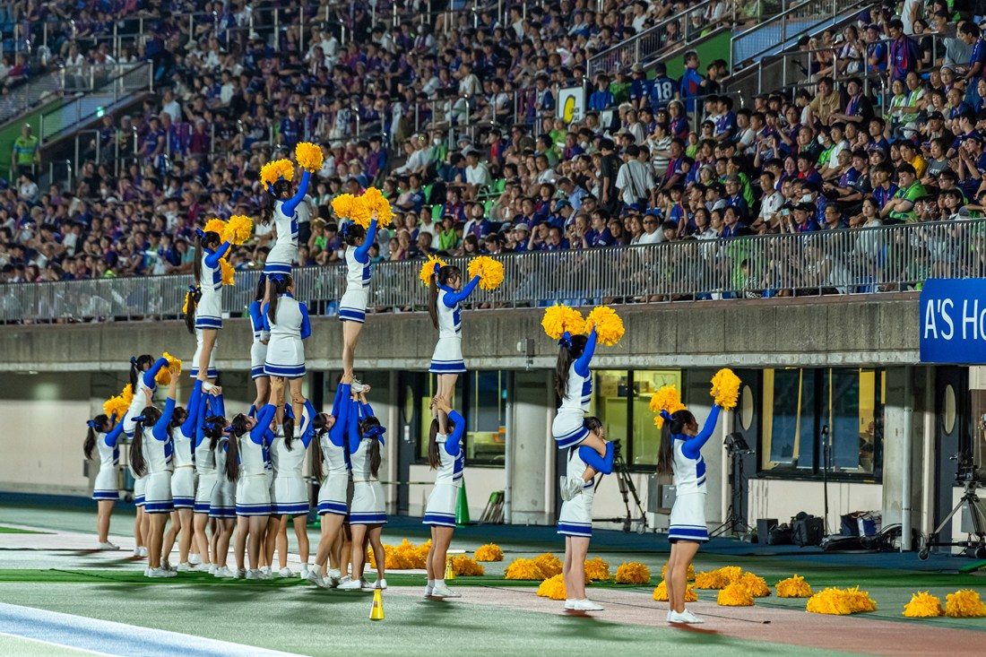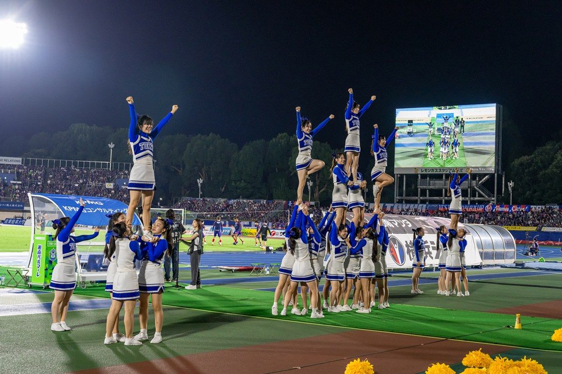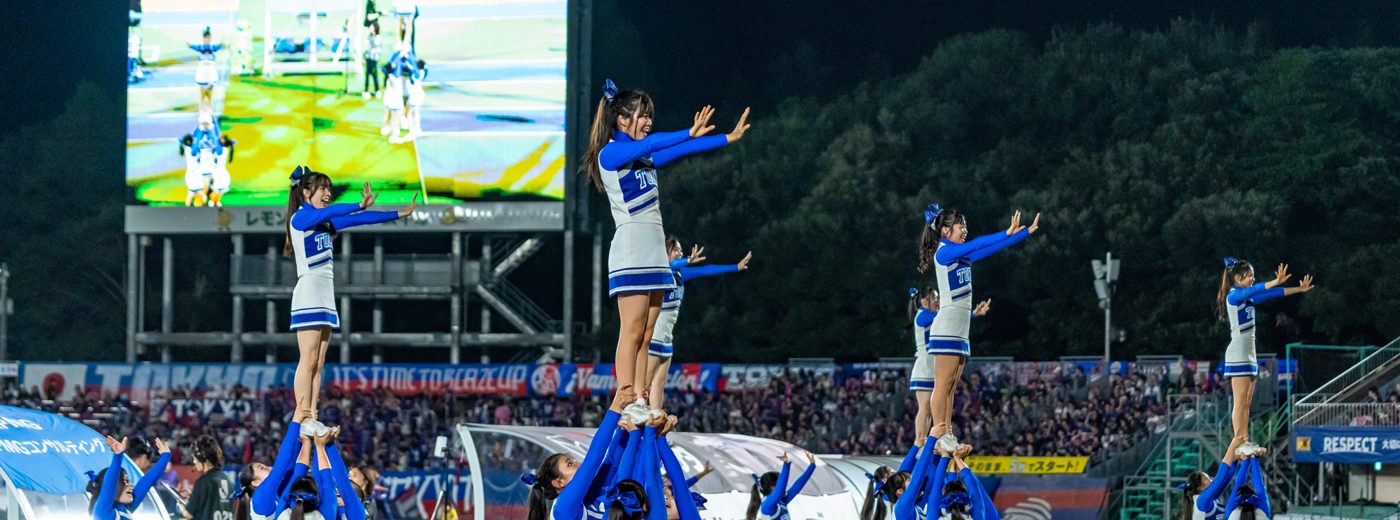 日ごろ出場しているチアリーディング大会の演技エリアは12m四方ですが、今回演技エリアとして用意されたのは、チームベンチ付近の縦5.5m、横37mのスペース。パフォーマンスに向けて選手たちは、横に広いスペースを生かした演技構成を考えてきました。当日は、前半終了後のハーフタイム中に、約1万3000人の観客の前で『タマシイレボリューション』の楽曲に合わせた約3分間の演技を披露。複数人で一人を持ち上げる「スタンツ」計8騎がピラミッドのように見えるよう、スタンツの高さに変化をつけながら横一列に並ぶなど、演技エリアを目いっぱい使ったパフォーマンスを見せ、終了後には観客から大きな拍手が送られました。