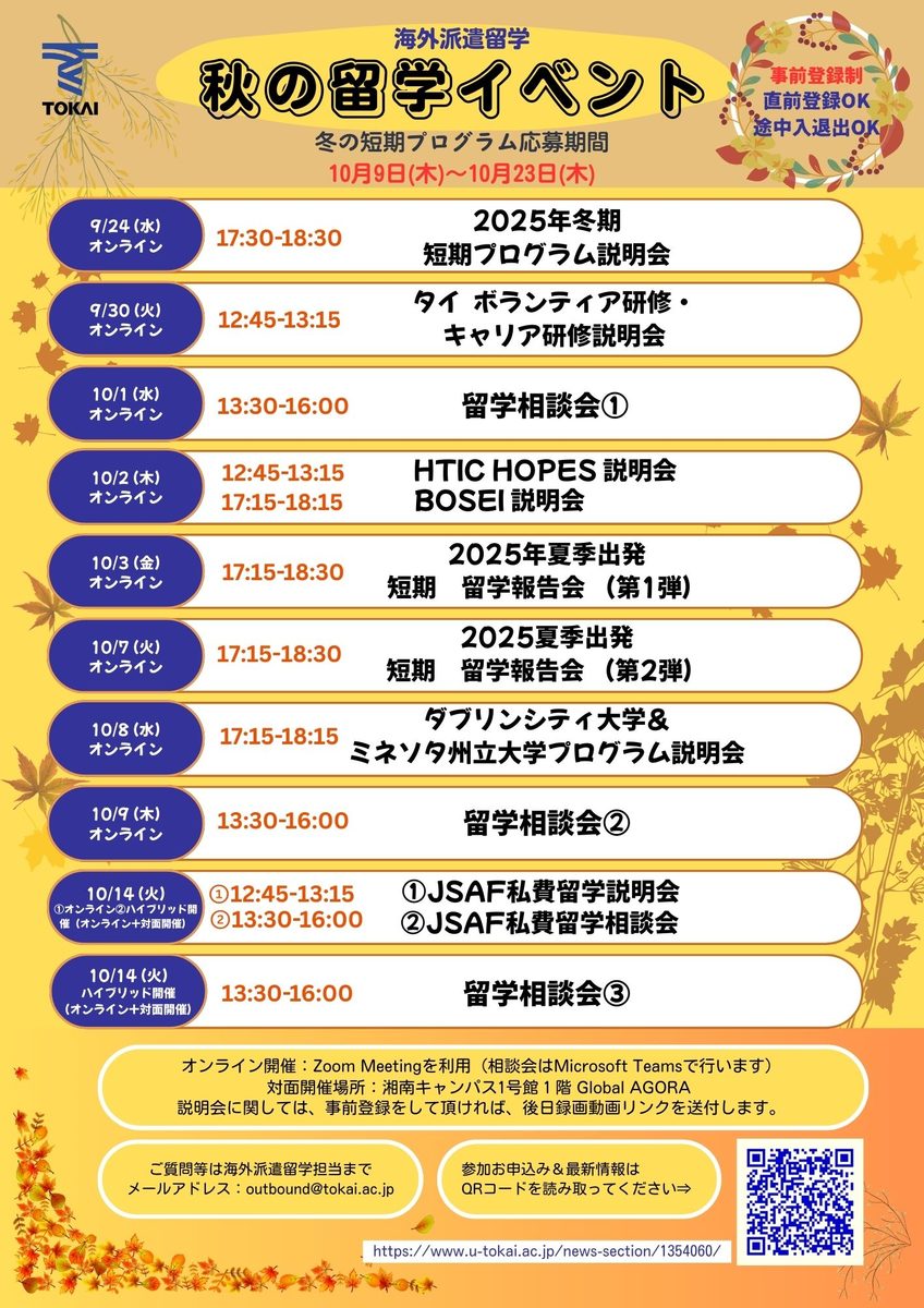 東海大学とパートナーシップを結んでいるJSAF(日本スタディーアブロードファンデーション)の留学プログラムについて、JSAF担当者とオンラインにて個別相談ができます。