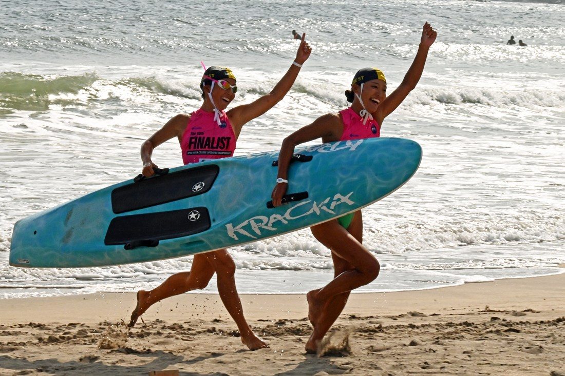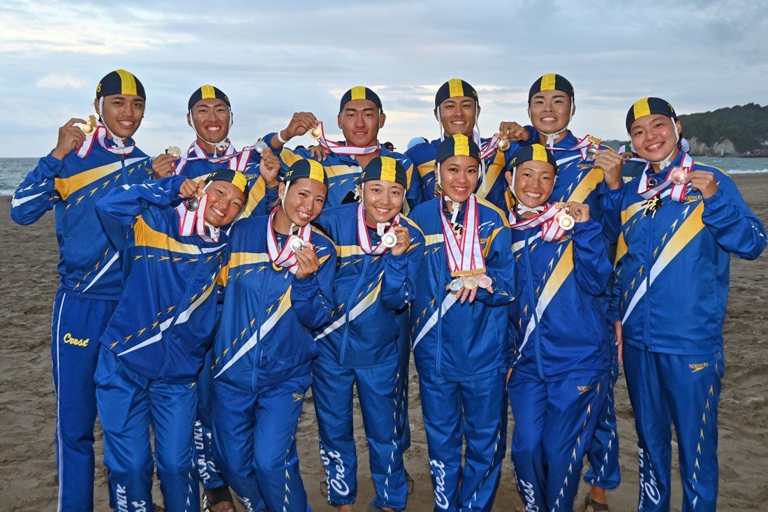 女子は、サーフレースを甚内優那選手(体育学部3年次生)が連覇。ビーチスプリントとビーチフラッグスを正木友海主将(同4年次生)が制し、ボードレスキューで甚内選手と久保田純令選手(同3年次生)のペアが頂点に立ち、計4種目を制覇しました。他の5種目でも表彰台に上る好成績を残し、2位の日本体育大学に17ポイント差をつけて連覇を決めました。団体総合準優勝となった男子は、ビーチリレーとボードレスキューで優勝し、サーフレースで後川由眞選手(情報通信学部3年次生)が、ビーチスプリントで小川慶生選手(国際学部3年次生)が準優勝しました。