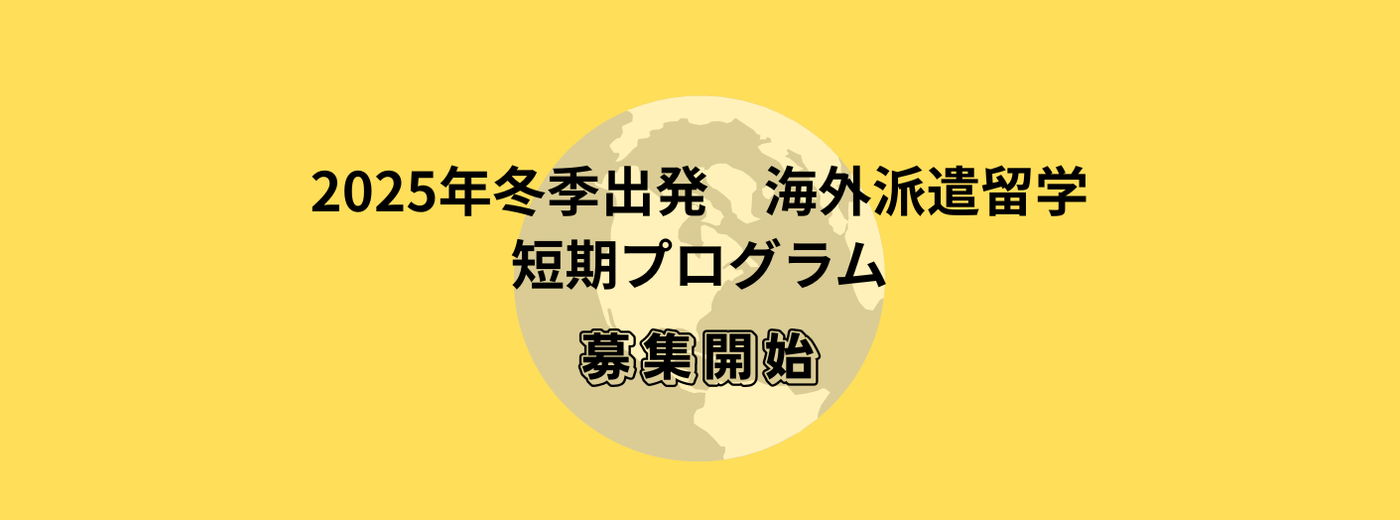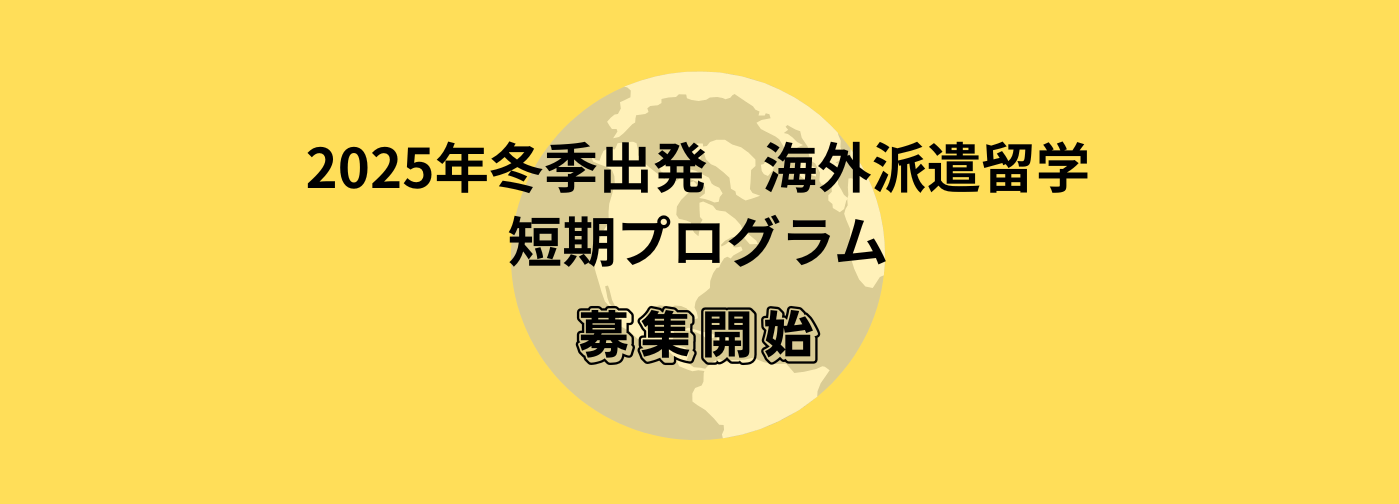 【本日より募集開始!】 2025年冬季出発 海外派遣留学 短期プログラム2025.10.09 本日より東海大学の2025年冬 海外派遣留学 短期プログラムの募集が始まりました!今こそ留学に向けてその一歩を踏みだしてみませんか?! 募集期間 2025年10月9日(木)~10月23日(木) 詳細は応募方法・選考ページをご確認下さい。 ※応募には指導教員の先生との面談も必要となりますので、早めに準備を始めましょう! 皆さんのご応募をお待ちしております!!!