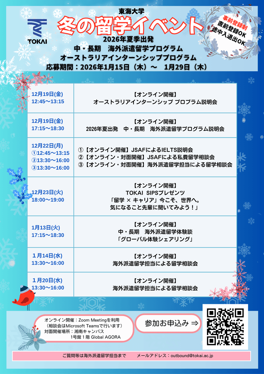 来年1月に2026年夏出発の中・長期 海外派遣留学プログラムの募集が始まります。そちらに向けて冬の留学イベントを企画しましたので、本学の留学プログラムに興味のある方も迷っている方も奮ってご参加ください。東海大学にはたくさんの留学プログラムがありますよ♪在学中に留学をお考えの方は今から情報収集を始めましょう!