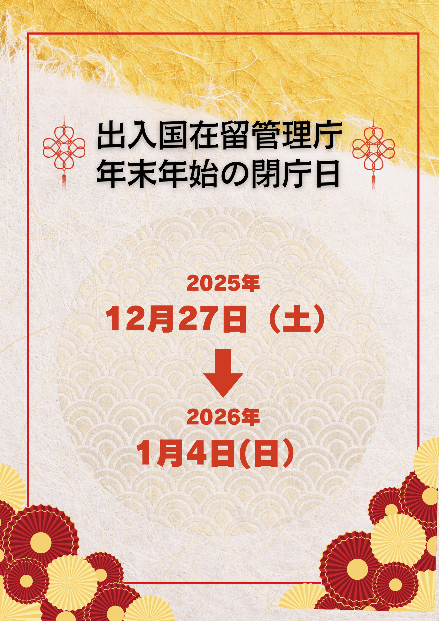 出入国在留管理庁は、12月27日(土)から1月4日(日)まで年末年始の閉庁期間となり、在留手続き窓口業務は行われませんのでご注意ください。