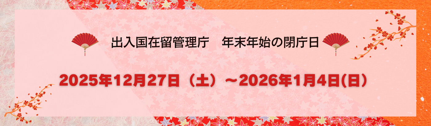 出入国在留管理庁は、12月27日(土)から1月4日(日)まで年末年始の閉庁期間となり、在留手続き窓口業務は行われませんのでご注意ください。