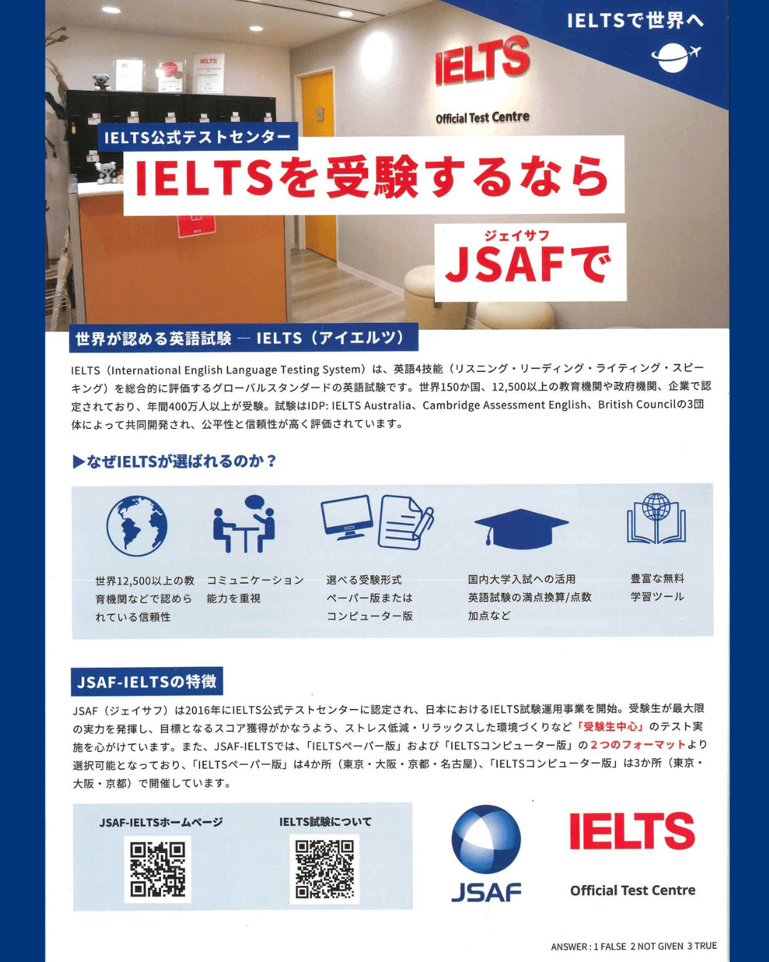 JSAF(ジエイサフ)は、一般財団法人 日本スタディ・アブロード・ファンデーションの略で、東海大学の学生が私費留学をする際のパートナーのひとつです。また、IELTSの公式テストセンターとしても認定されています。