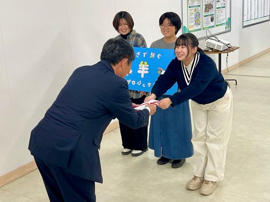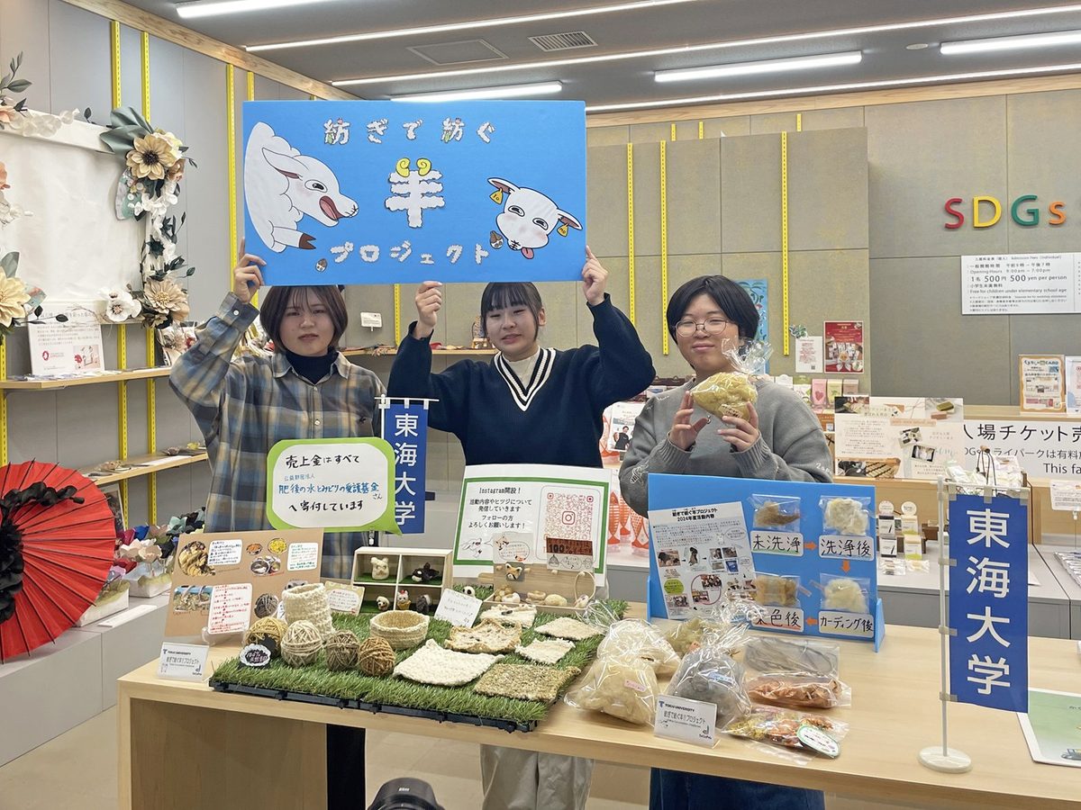 ToCoチャレ「紡ぎで紡ぐ羊プロジェクト」が昨年12月16日から、阿蘇くまもと空港に隣接する教育テーマパーク「くまもとSDGsミライパーク」で羊毛を使ったハンドメイド作品の常設販売を開始。今後、売り上げを公益財団法人「肥後の水とみどりの愛護基金」に寄付するため、プロジェクトリーダーの加茂朱李さん(農学部3年次生)から愛護基金の田邉元事務局長に目録を手渡しました。